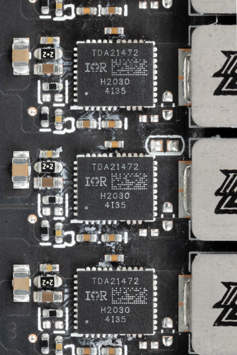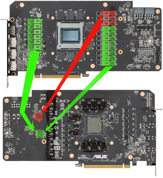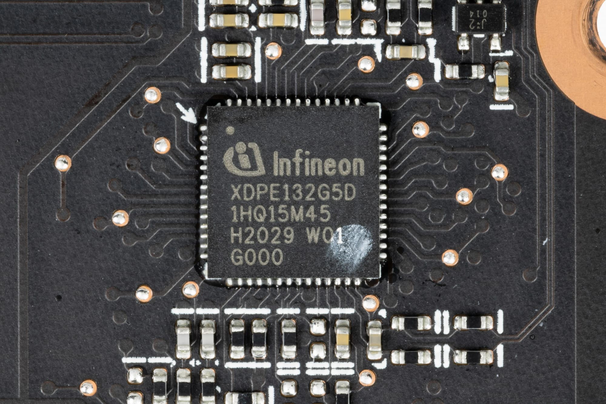 Зеленым цветом отмечена схема питания ядра, красным — памяти. 16-фазный ШИМ-контроллер XDPE132G5D (Infineon) управляет 14 фазами питания GPU (сам контроллер расположен на оборотной стороне PCB).