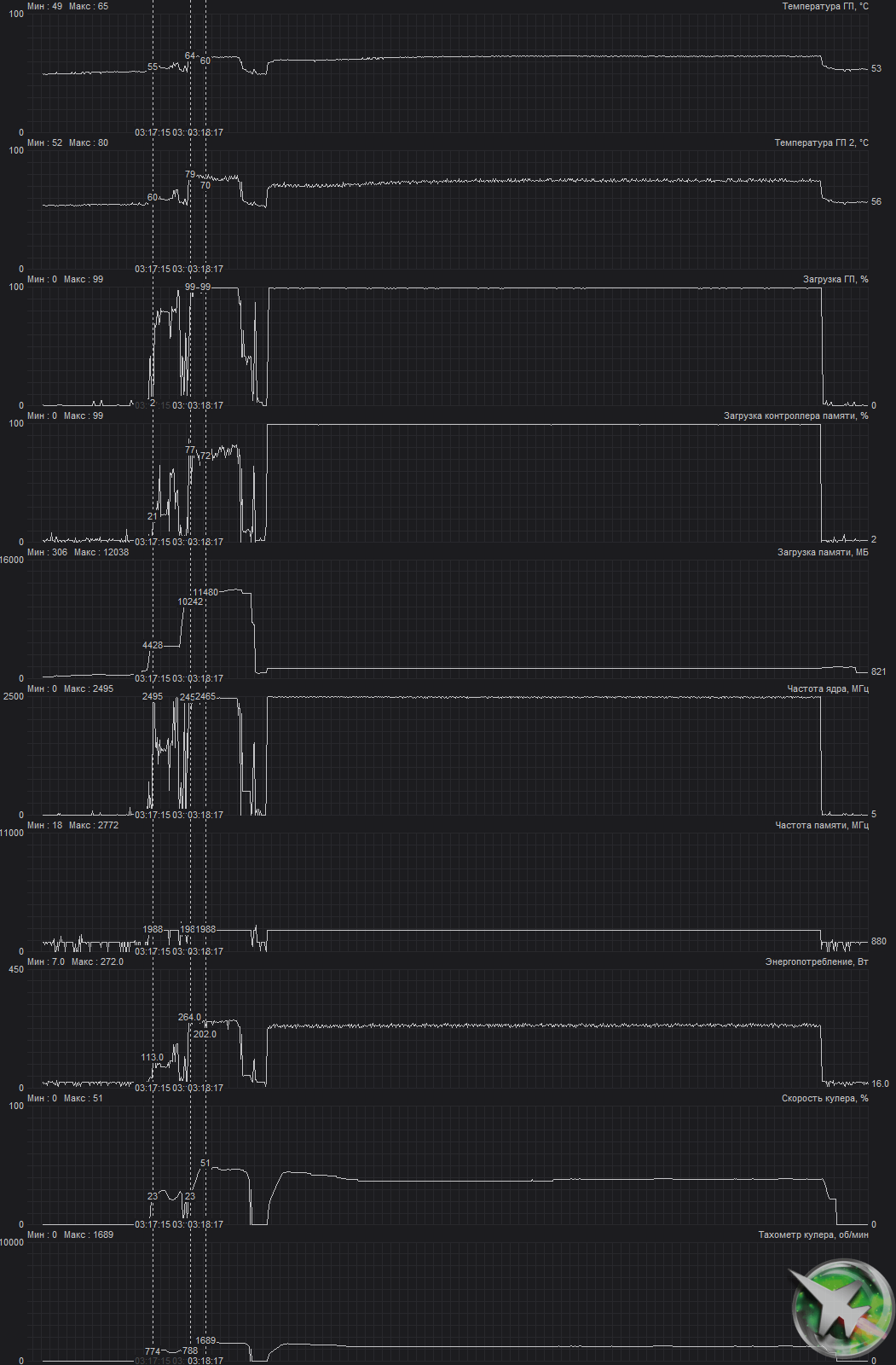 При описанном ручном разгоне параметры работы карты особо не менялись, а максимальное потребление вырастало до 288 Вт.