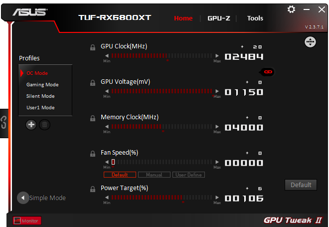 А вот мониторингом заведуют уже встроенные средства AMD, поскольку привычного контроллера ITE IT8915 тут нет (на картах семейства ROG Strix он управляет двумя коннекторами FanConnect II для корпусных вентиляторов, которые смогут работать в зависимости от нагрева видеокарты, а этом еще отличие ROG Strix от TUF Gaming: в последнем случае коннекторов FanConnect II нет).