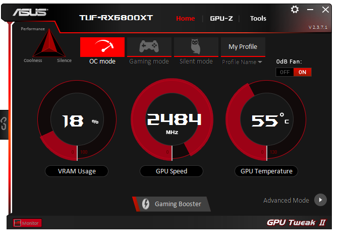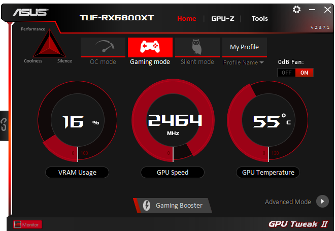 В простое режимы Performance Mode и Quiet Mode совершенно не отличались: в 2D температура была не выше 43 °C, вентиляторы не работали, уровень шума был равен фоновому — 18 дБА.