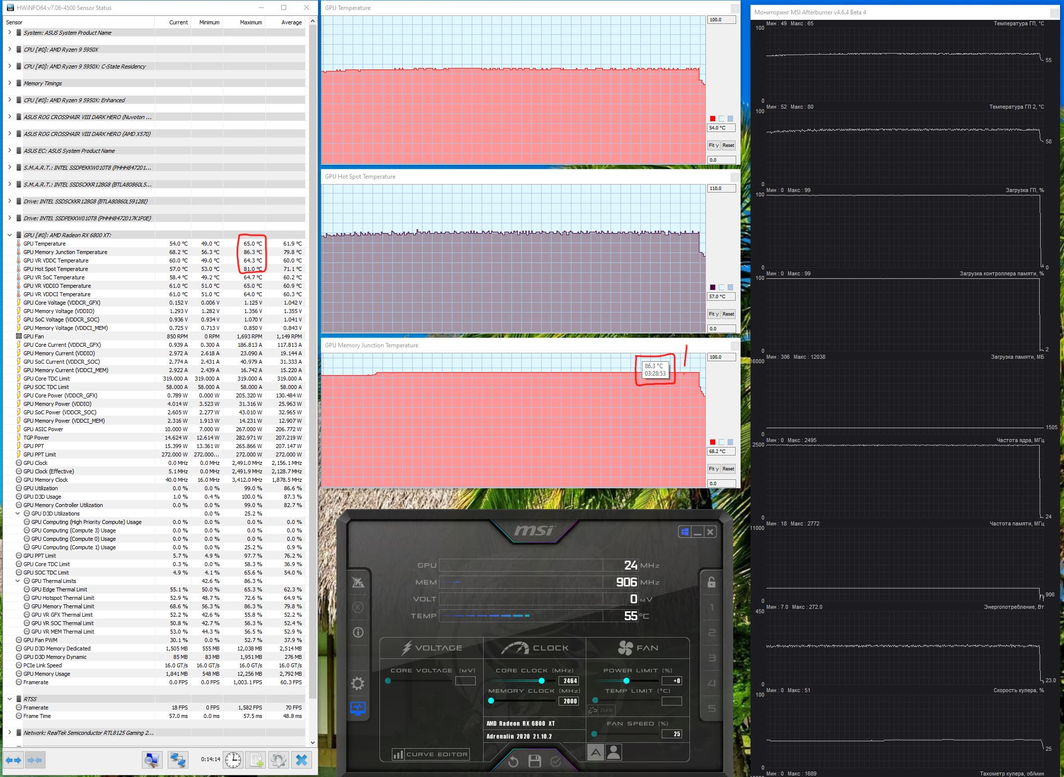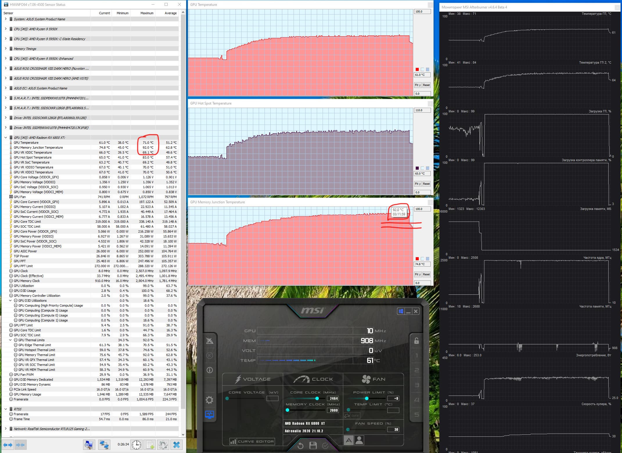 У карт на базе Radeon имеется возможность получать температуру нагрева микросхем памяти GDDR6 через ПО AMD (мы помним, что микросхемы GDDR6X имеют свои датчики температуры, и эти данные уже используют некоторые программы слежения за состоянием ПК типа HWinfo). И нагрев в целом был некритичным.