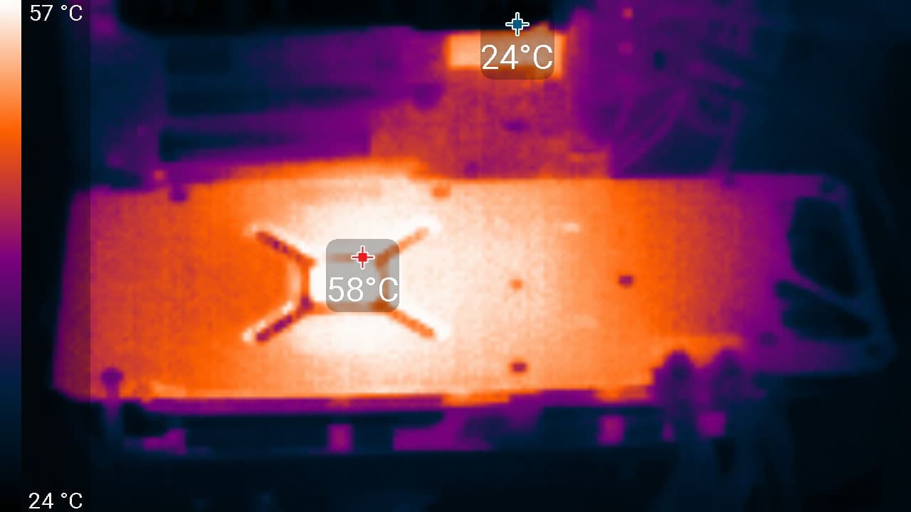 В этом режиме нагрев ядра был несколько выше — 70 °C, но вентиляторы вращались медленнее. Максимальный нагрев памяти GDDR6 вырастал до 92 градусов, это тоже не критично.