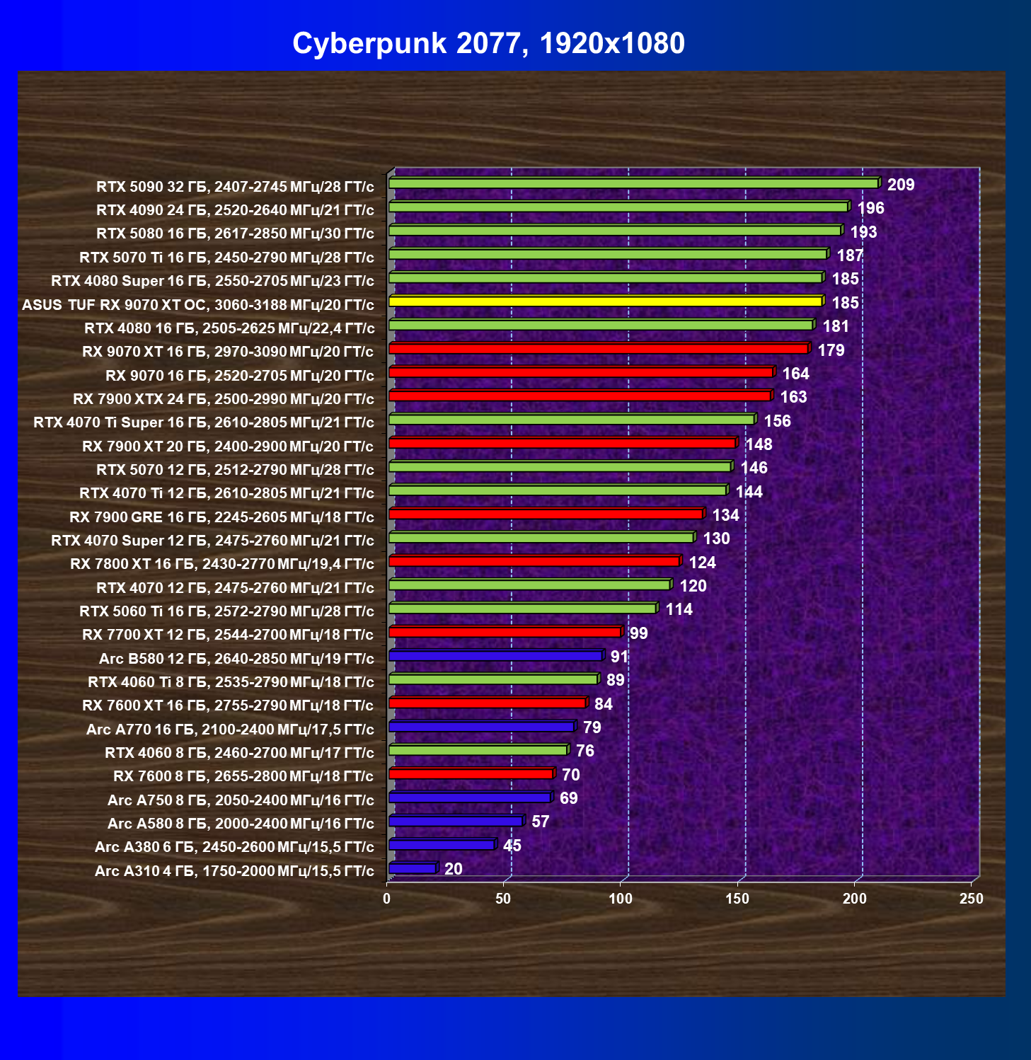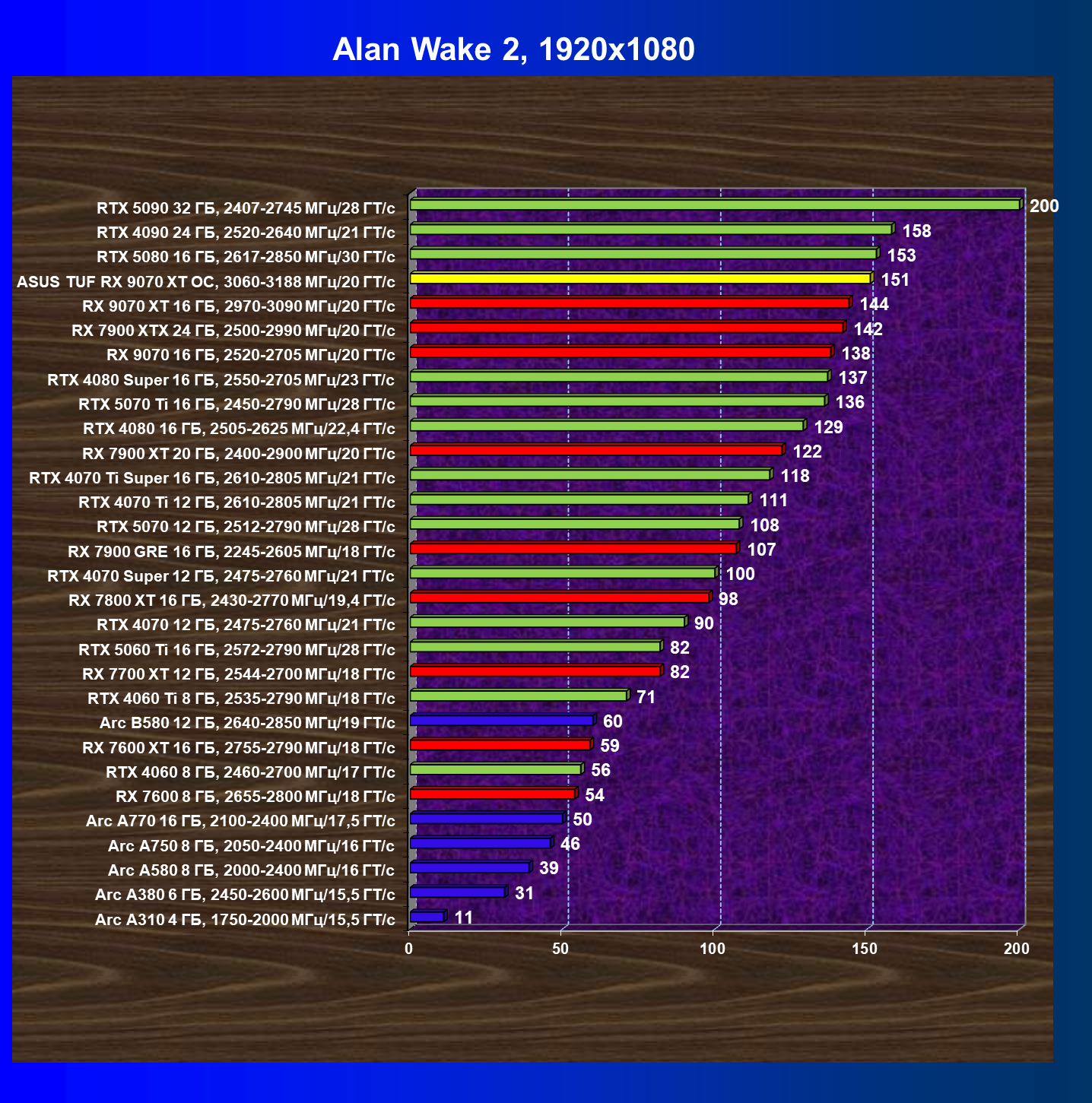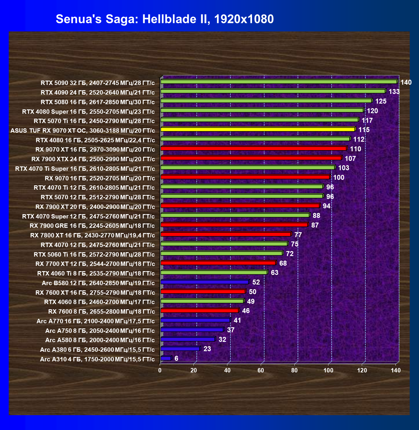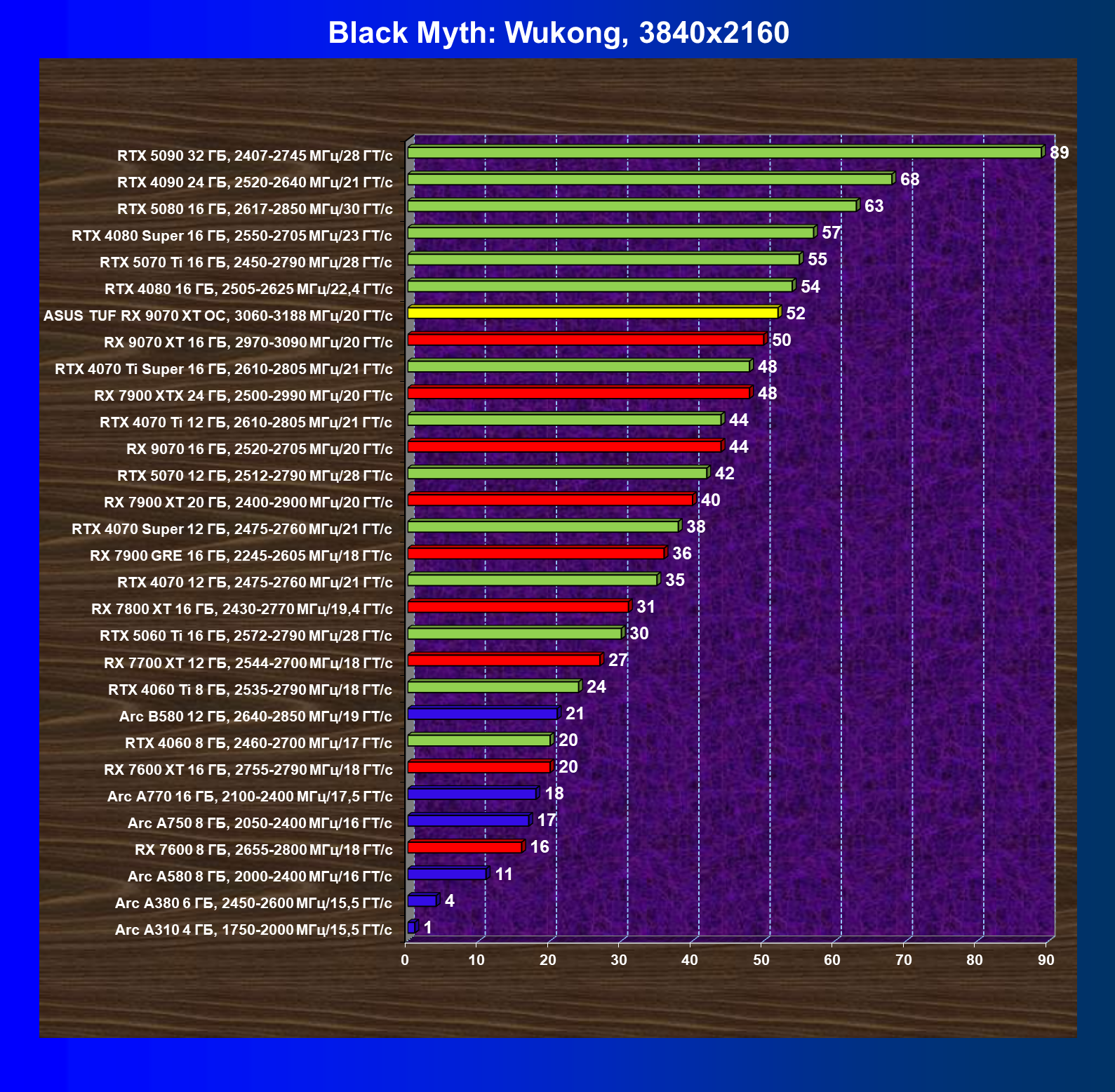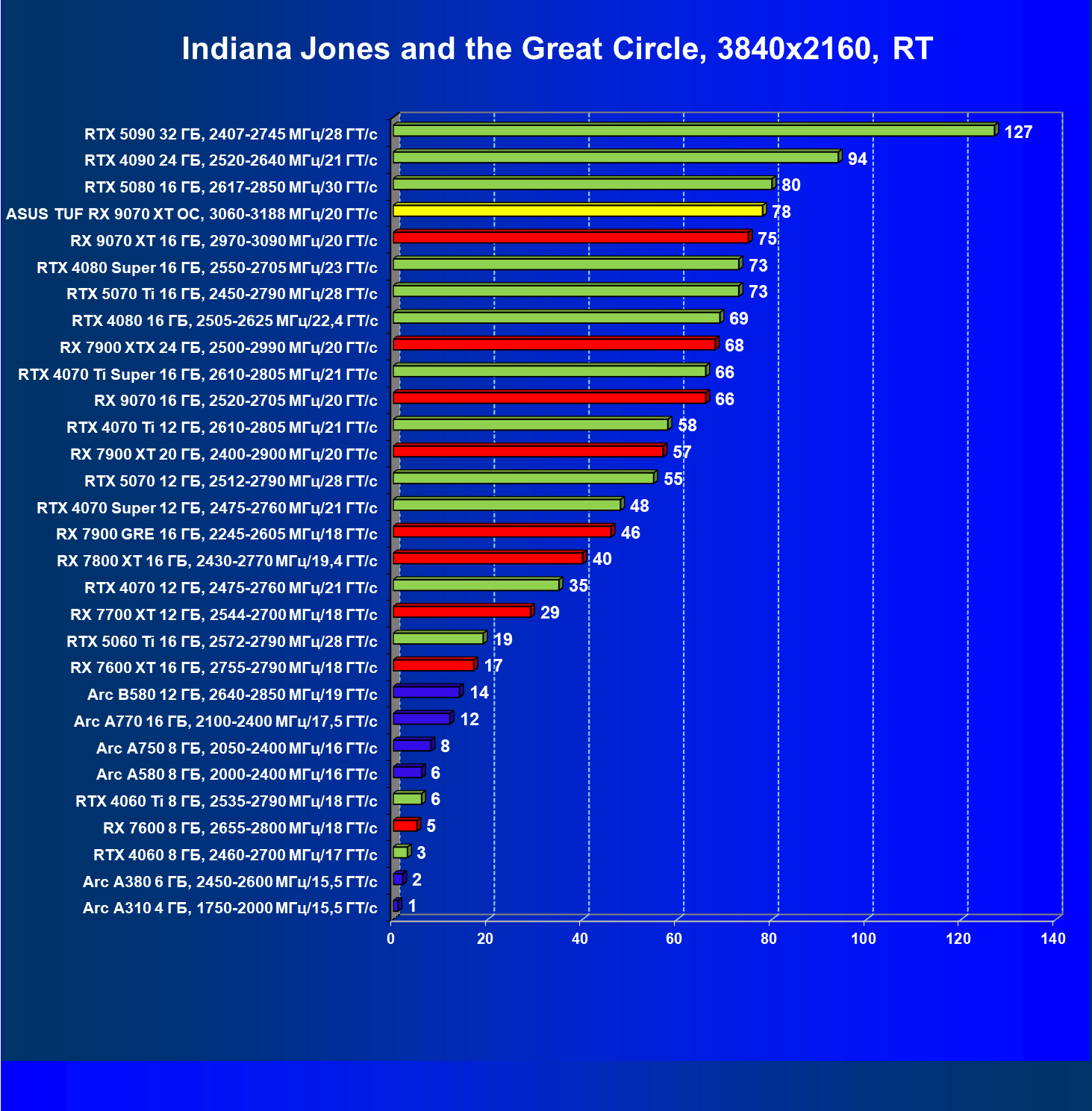 | 07 | RX 9070 XT 16 ГБ, 2970—3090 МГц/20 ГТ/с | 2168 | 244 | 89 000 |