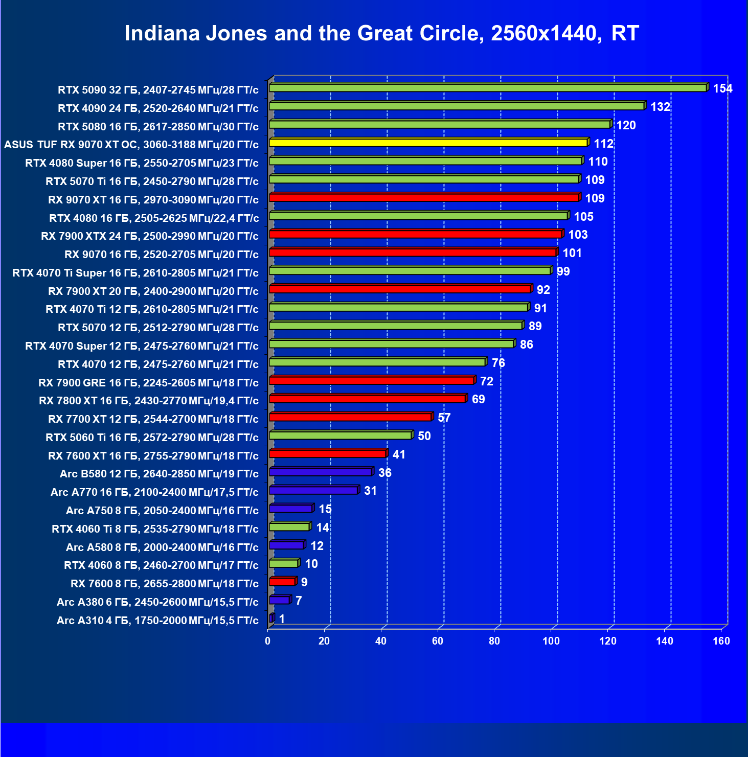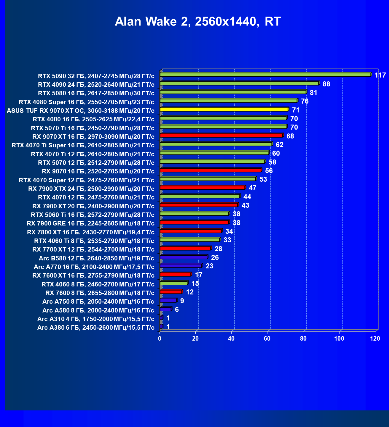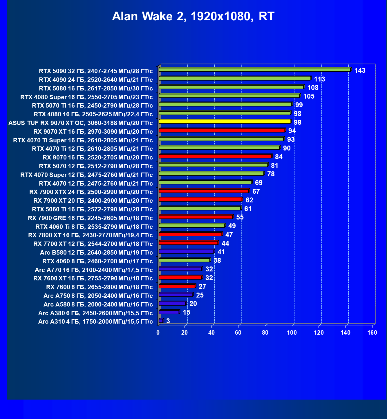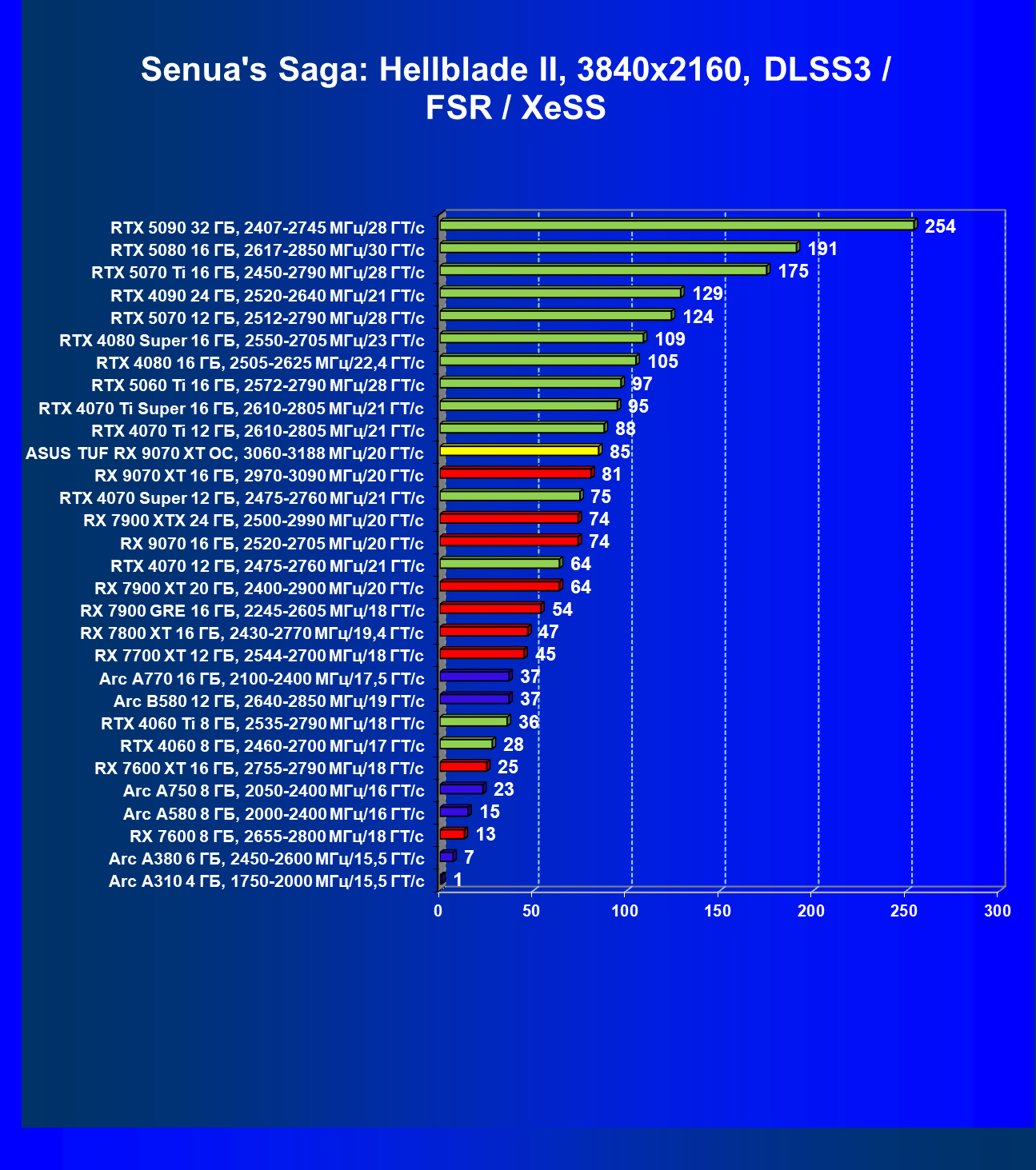 | 07 | RX 9070 XT 16 ГБ, 2970—3090 МГц/20 ГТ/с | 2168 | 244 | 89 000 |