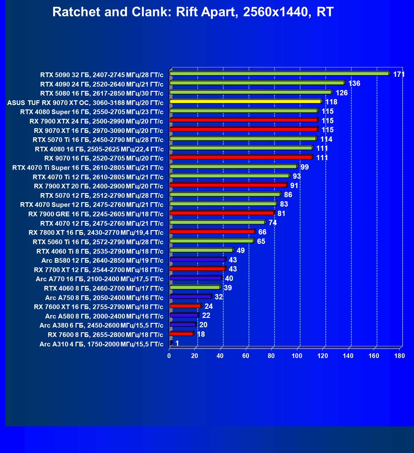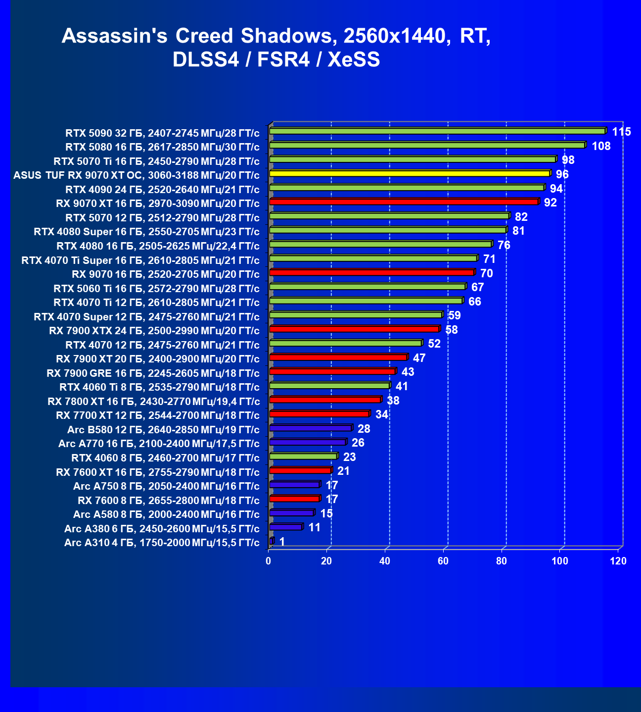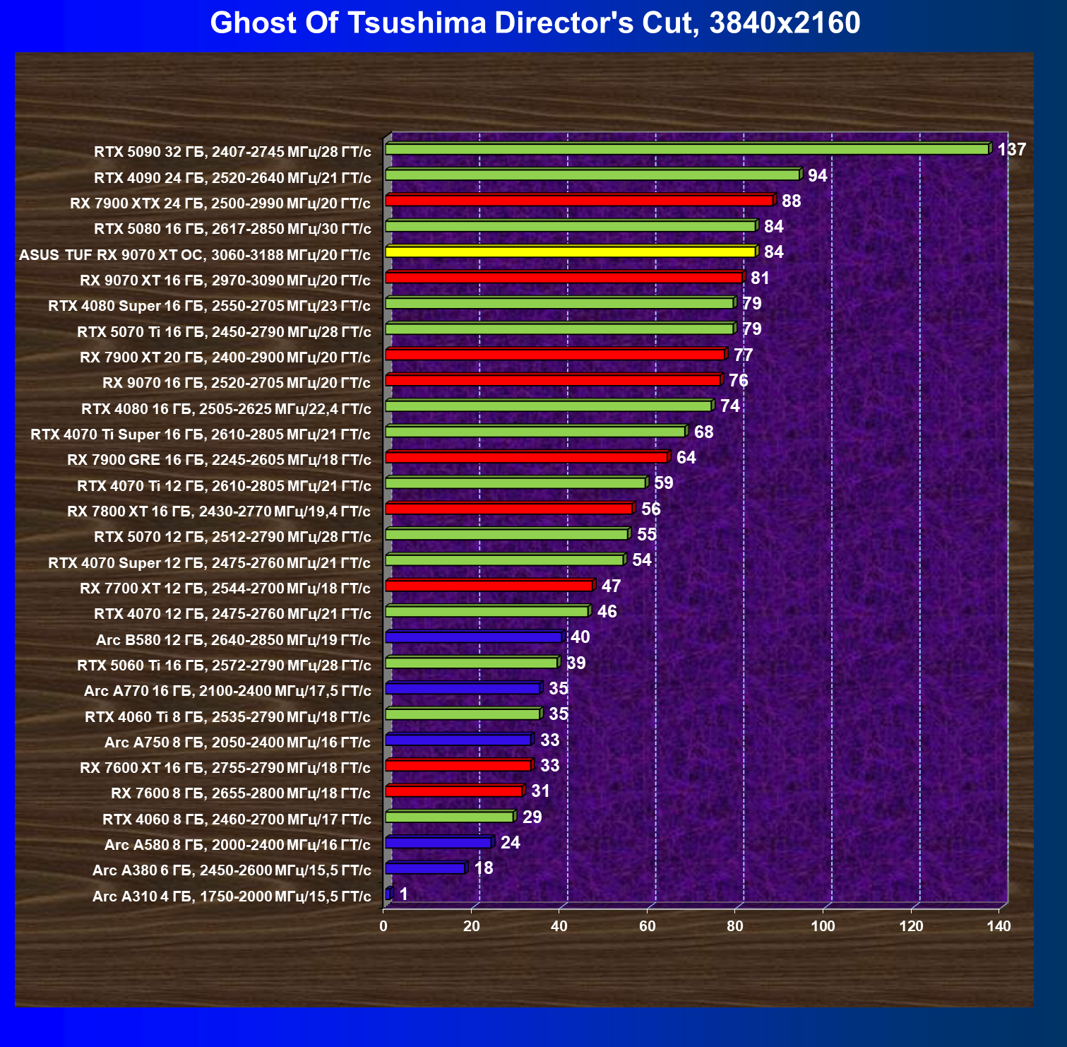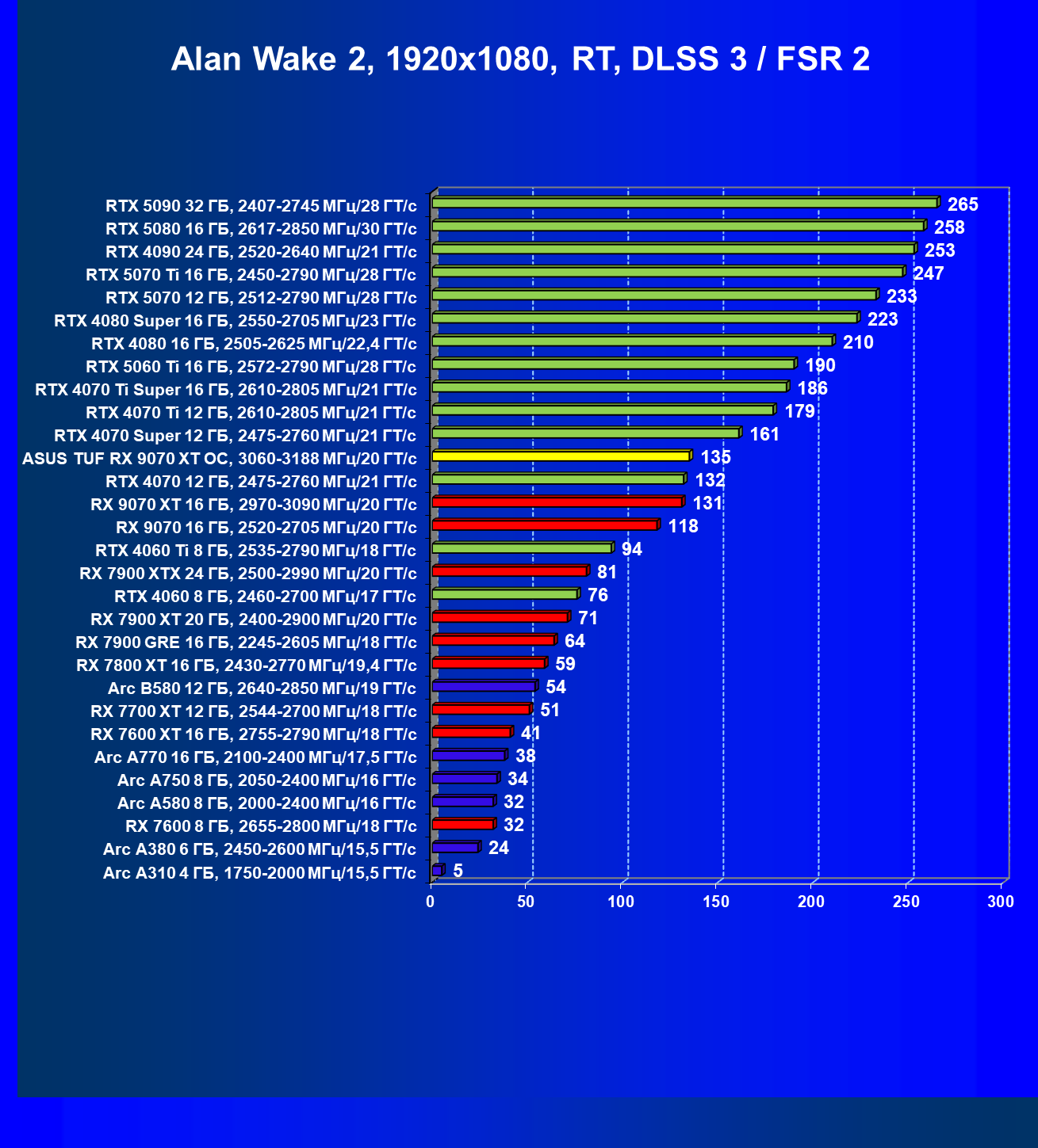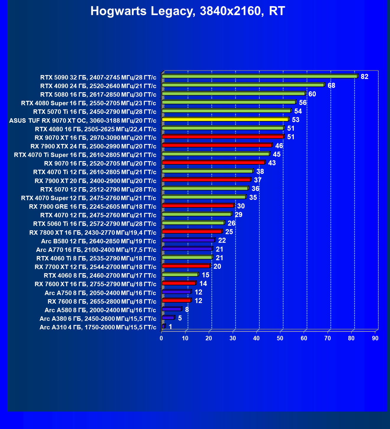 | 07 | RX 9070 XT 16 ГБ, 2970—3090 МГц/20 ГТ/с | 2168 | 244 | 89 000 |