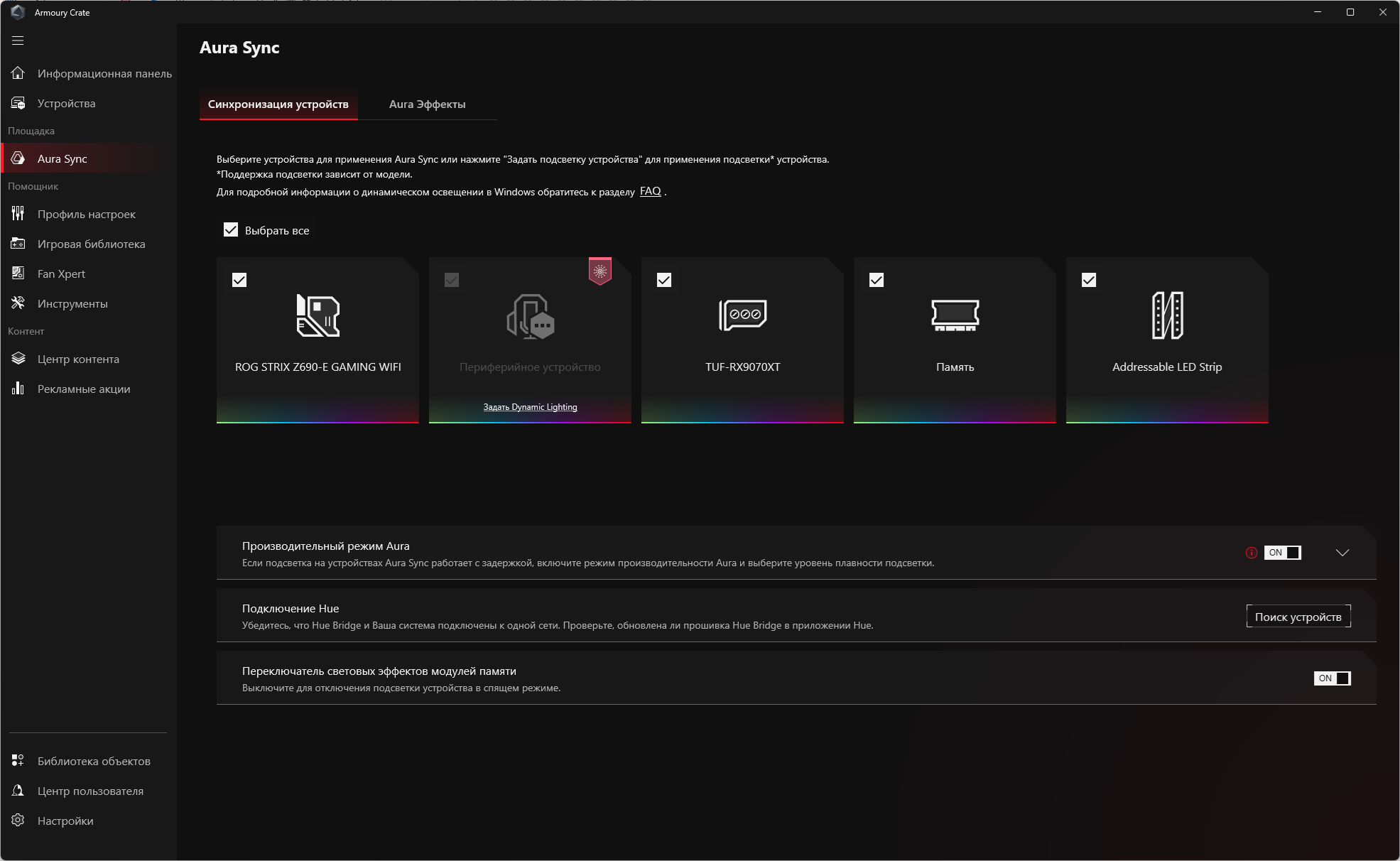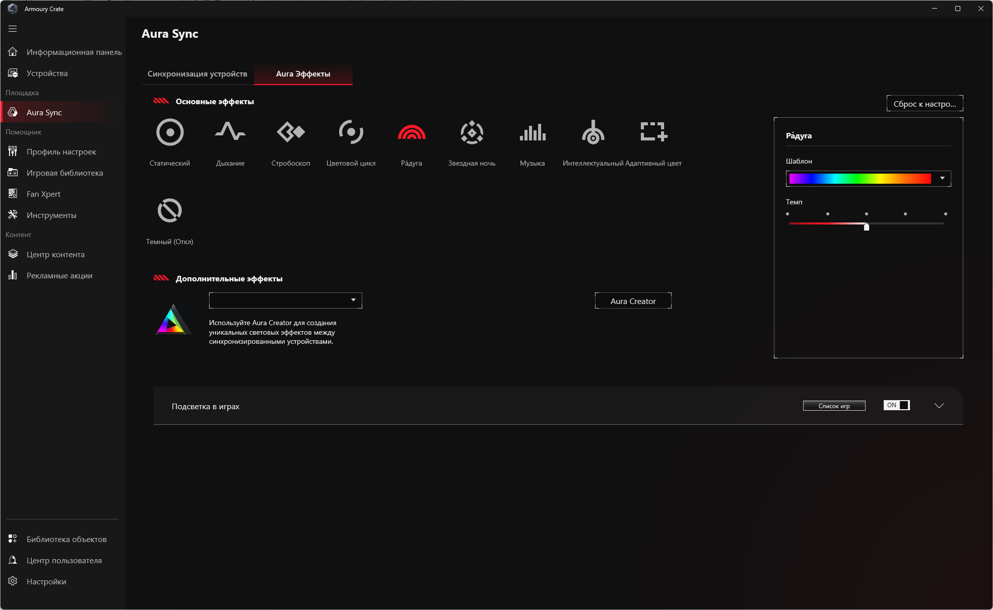 Управление режимами подсветки, в том числе и ее отключением, осуществляется утилитой Asus Armoury Crate. Подсветка может синхронизироваться с материнскими платами, но только от Asus.
