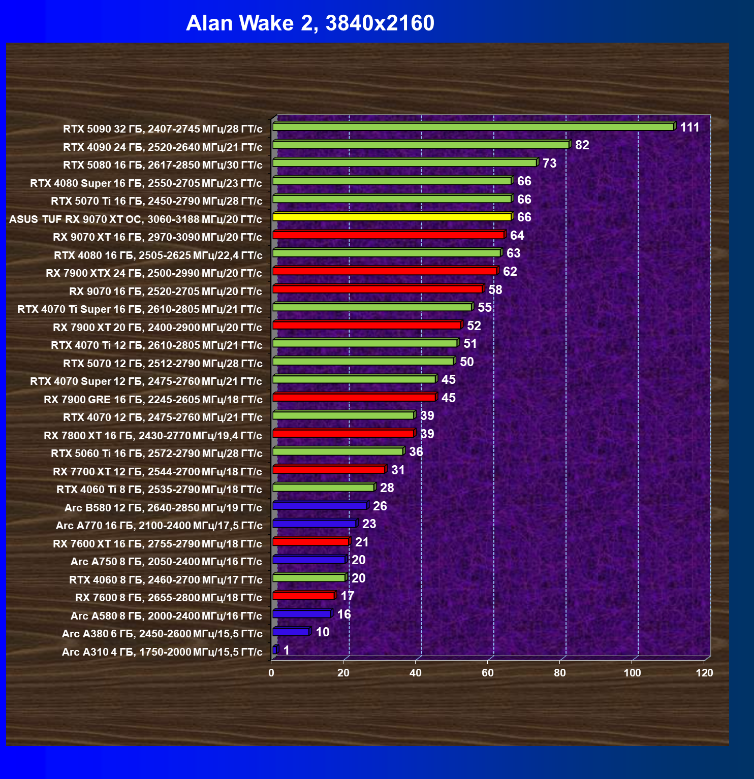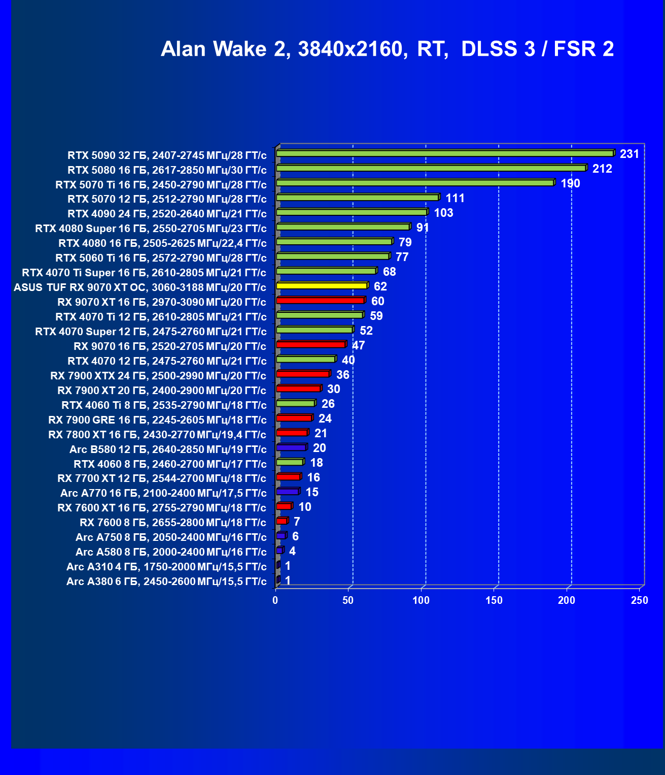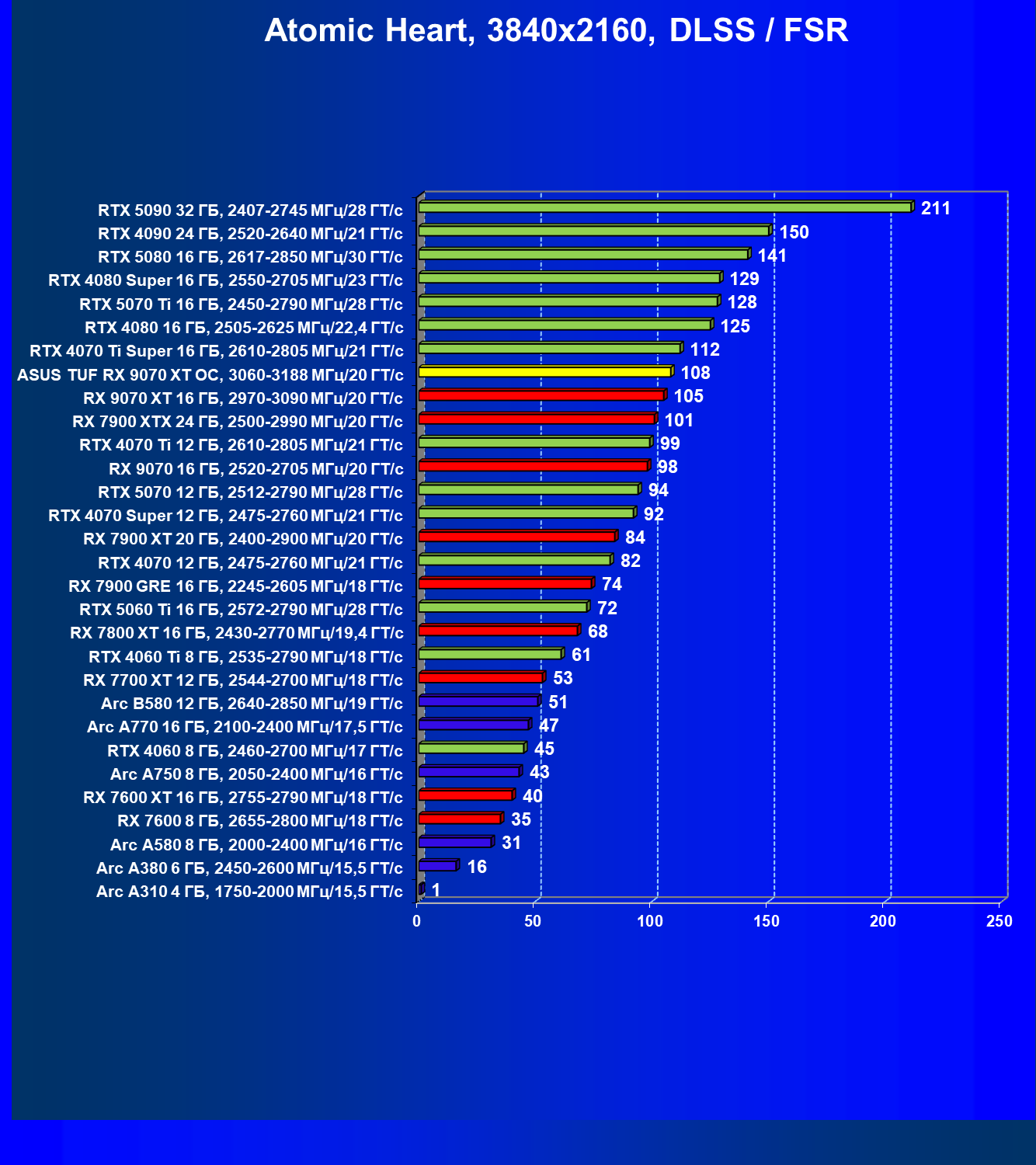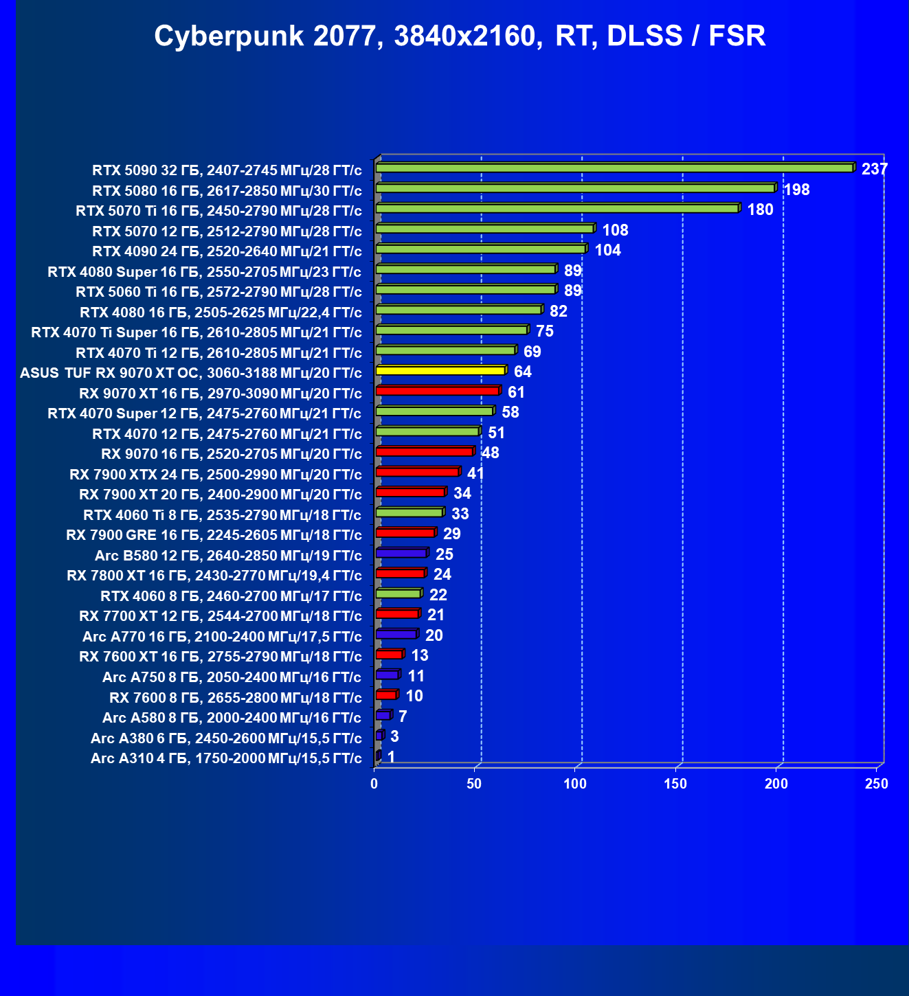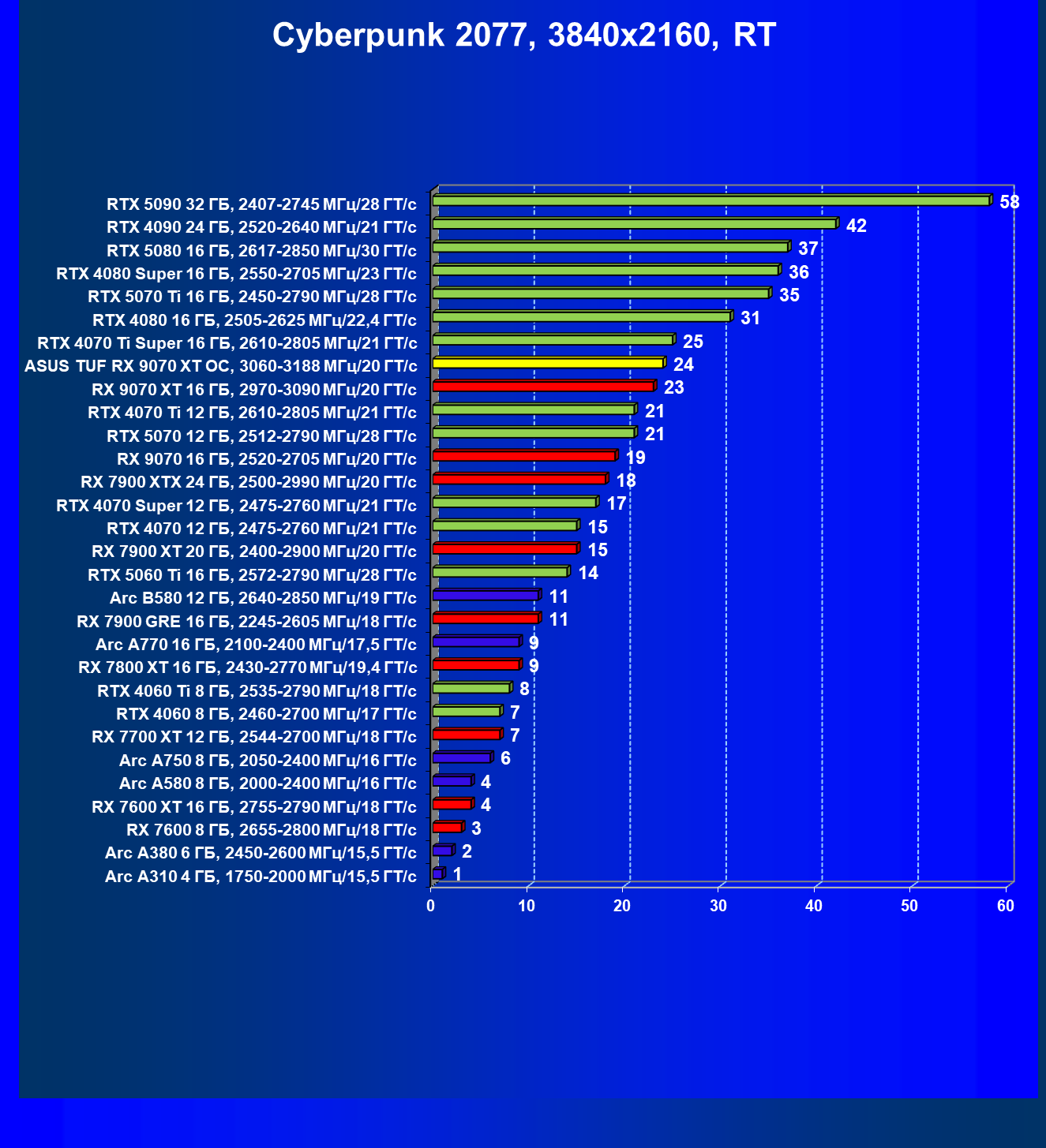 | 05 | Asus TUF RX 9070 XT OC, 3060—3188 МГц/20 ГТ/с | 2252 | 242 | 93 000 |