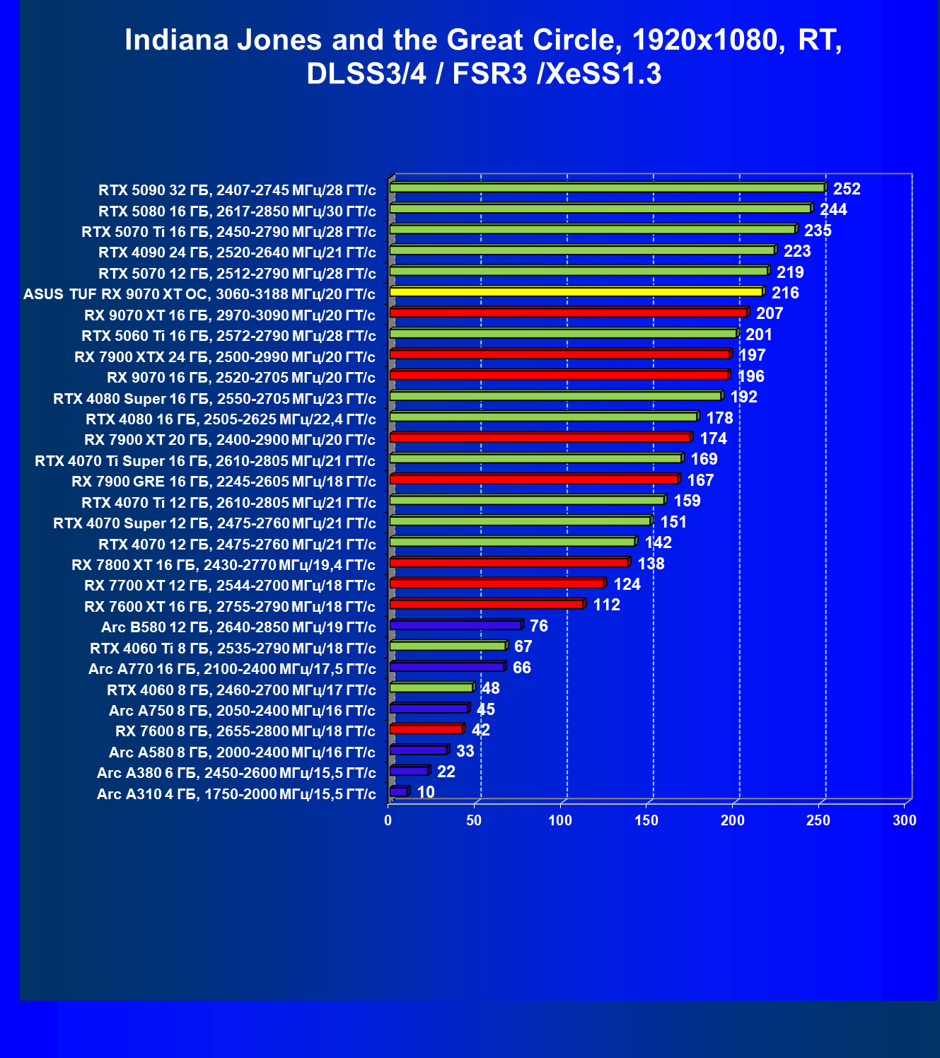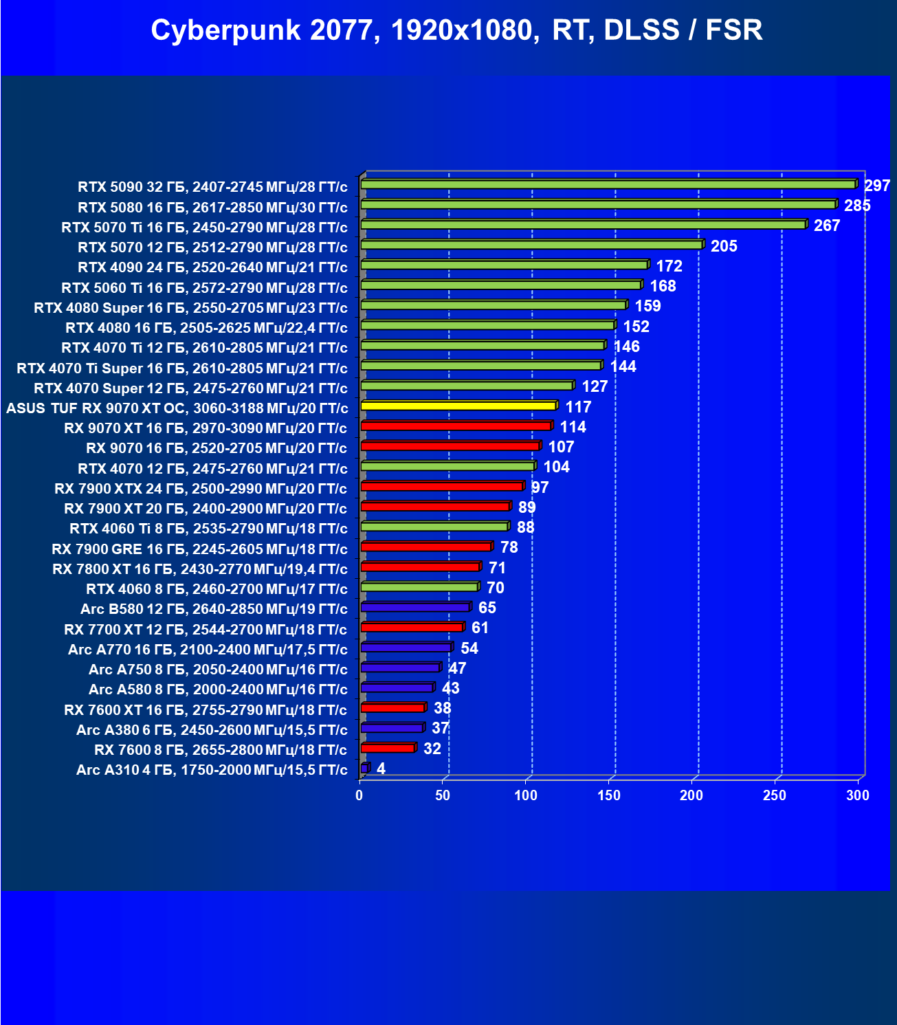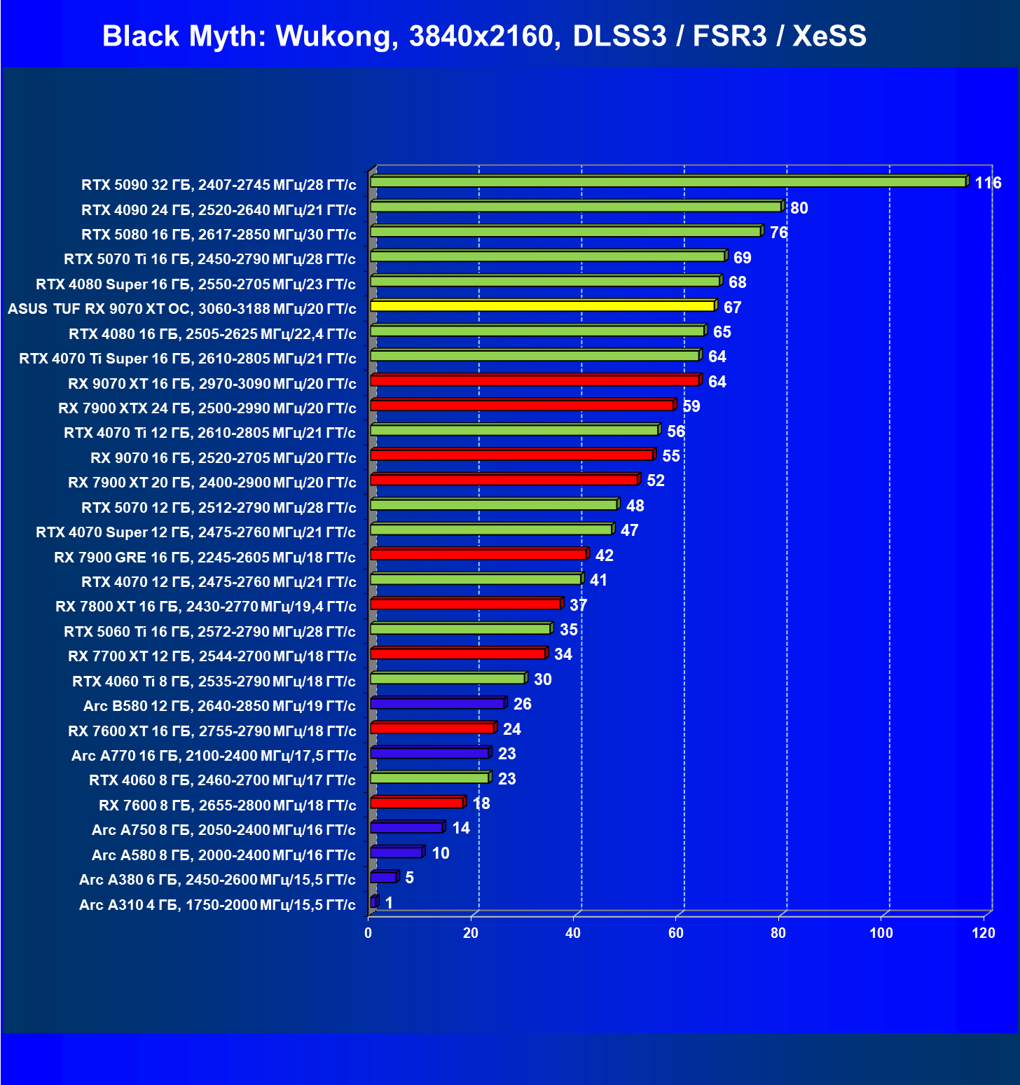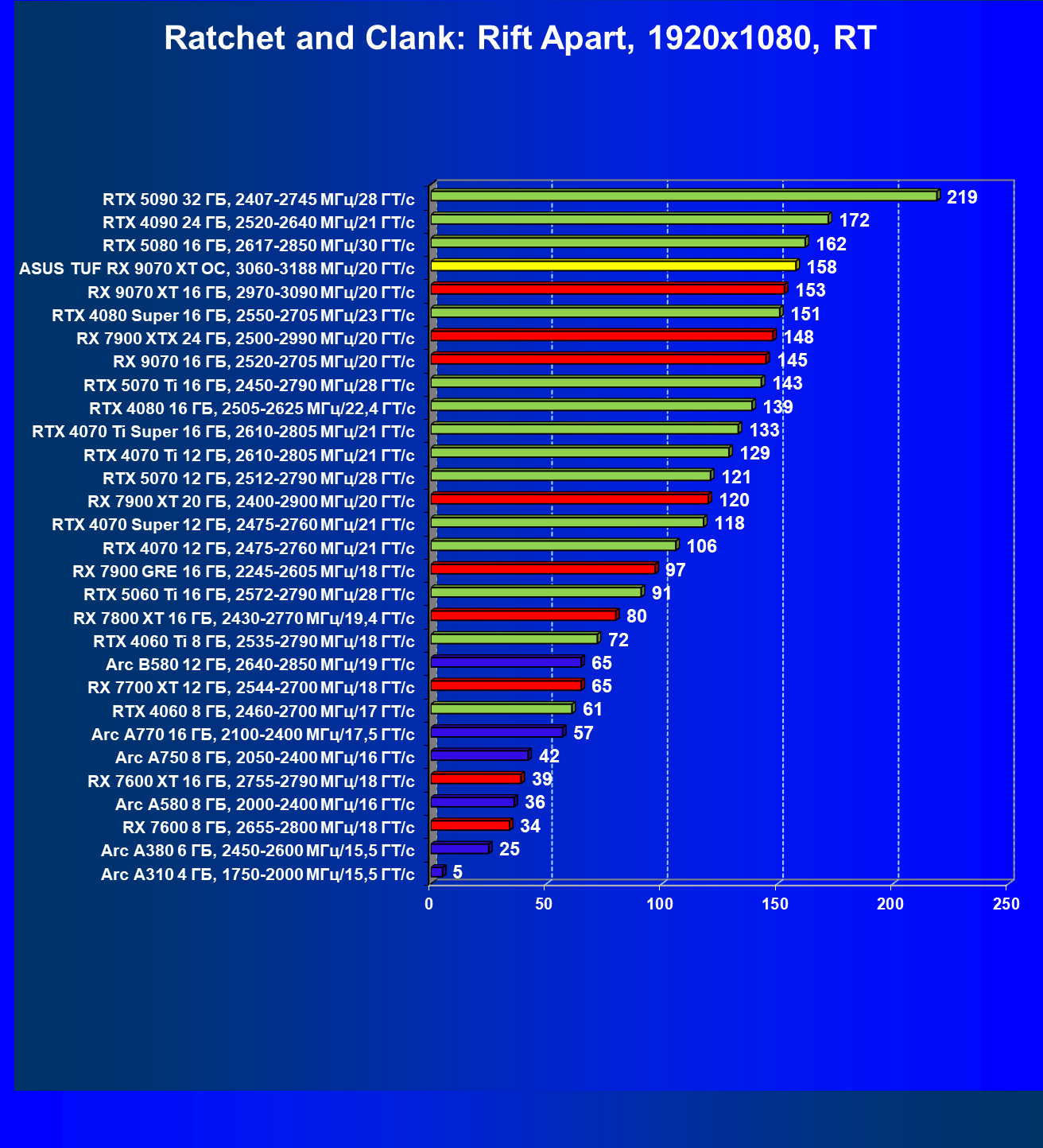 | 05 | Asus TUF RX 9070 XT OC, 3060—3188 МГц/20 ГТ/с | 2252 | 242 | 93 000 |