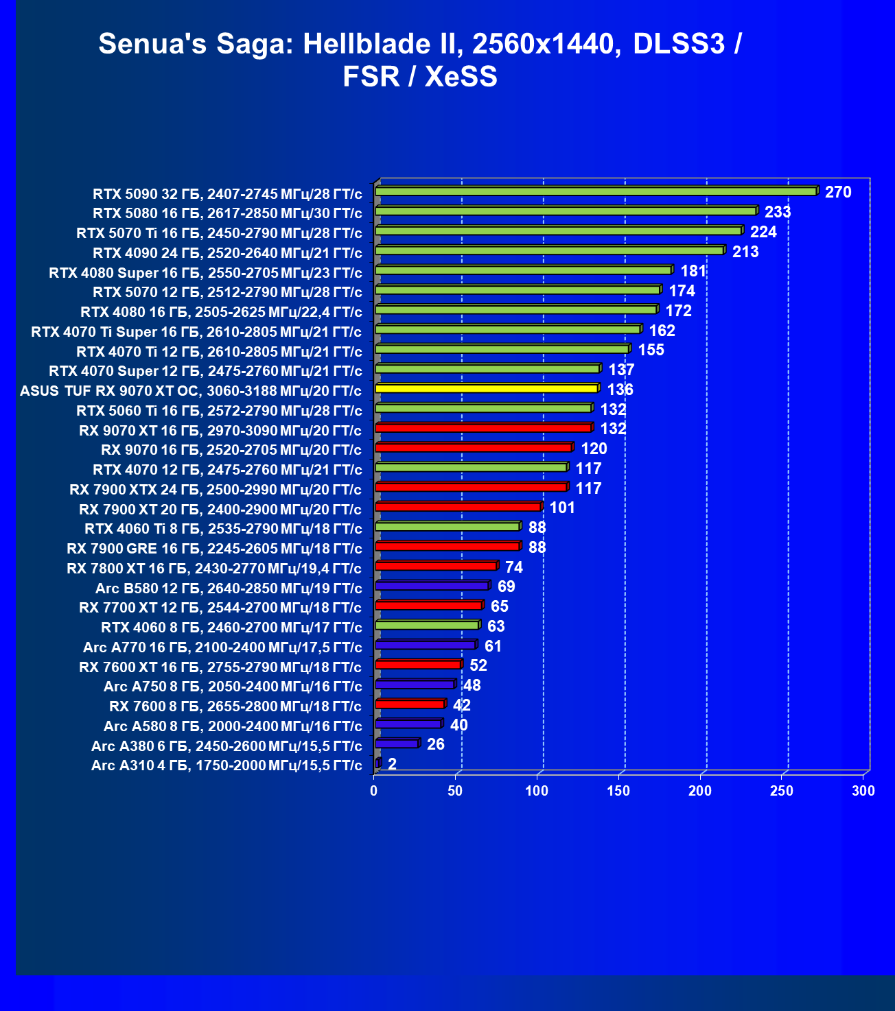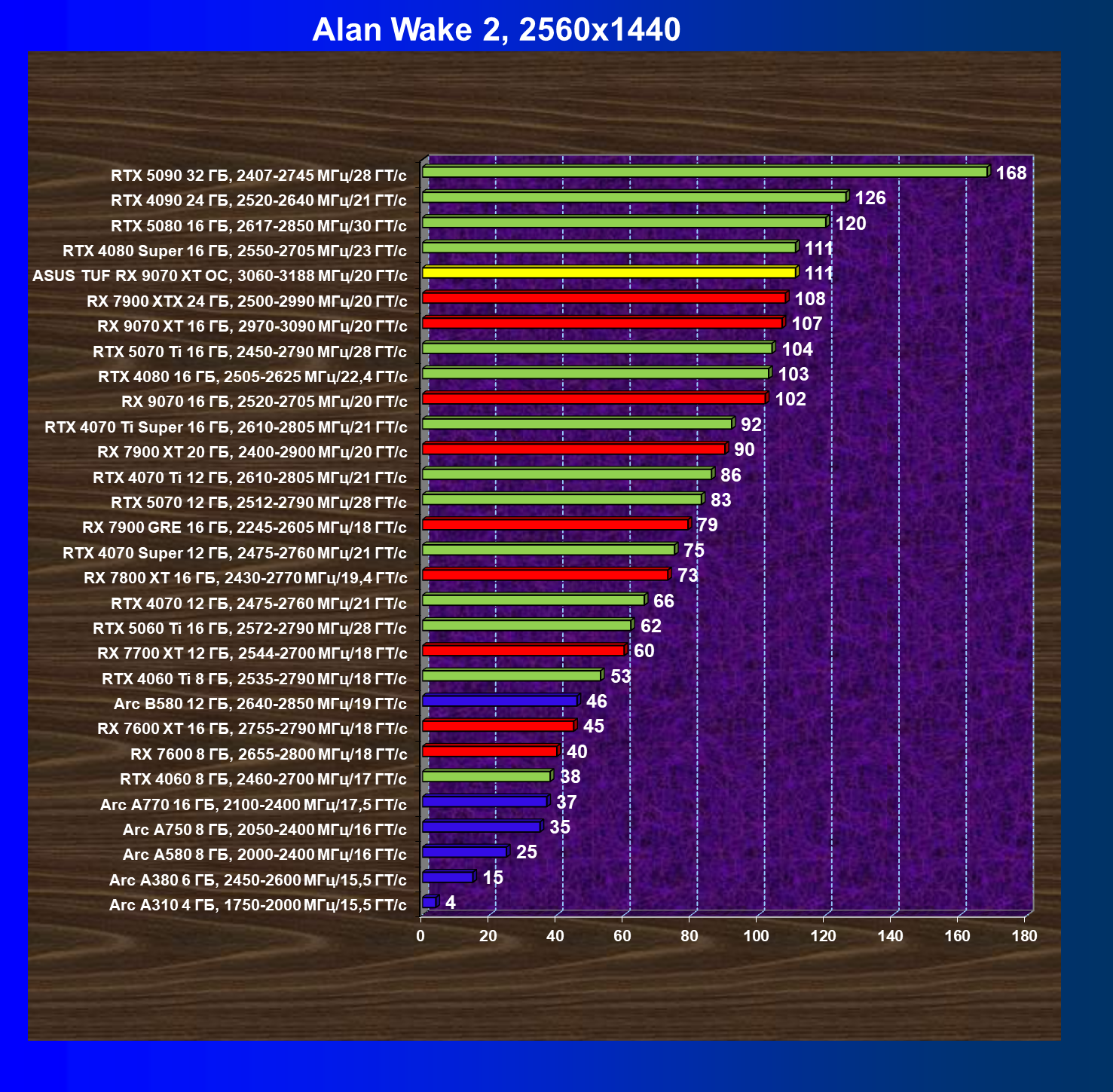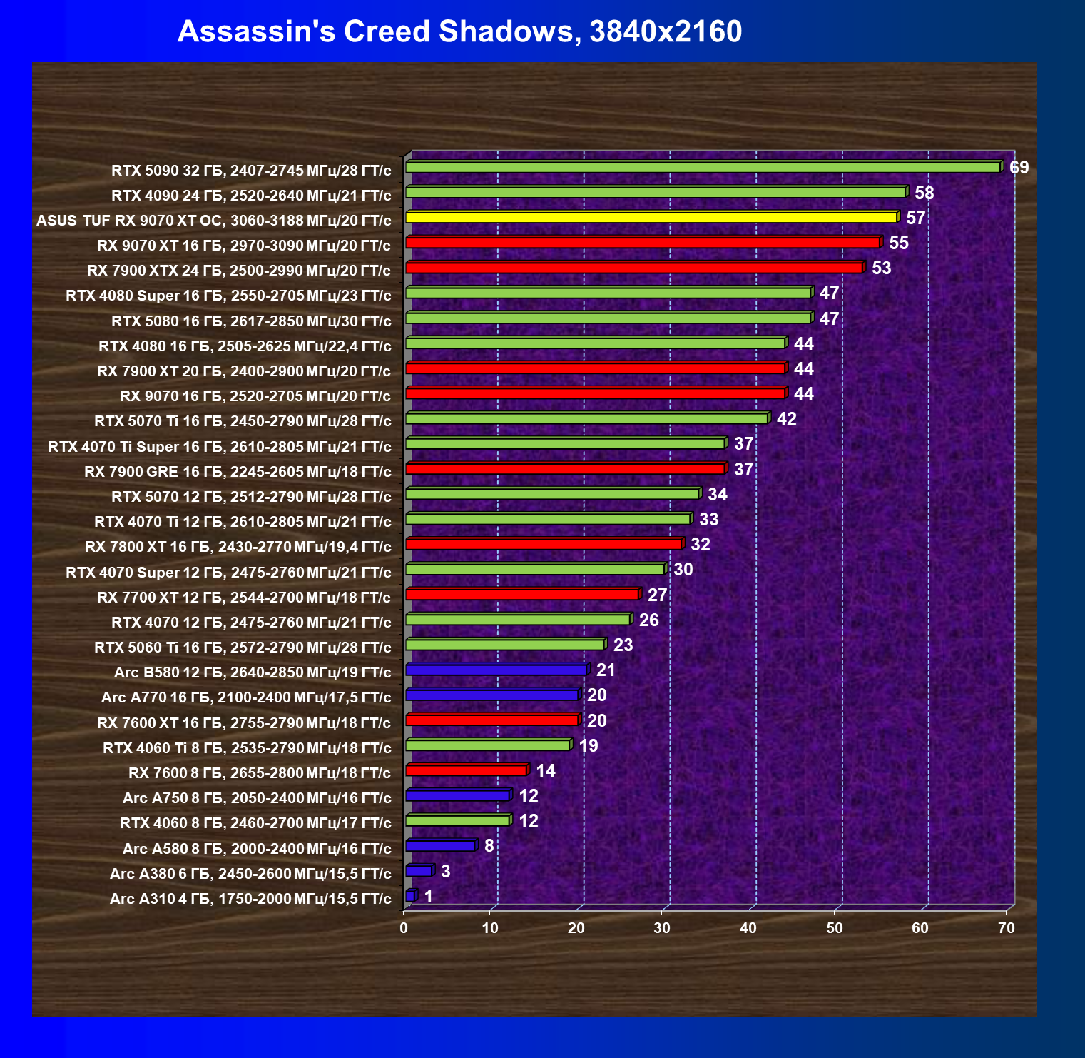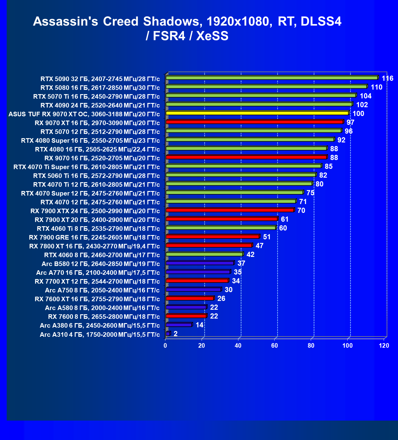 | 05 | Asus TUF RX 9070 XT OC, 3060—3188 МГц/20 ГТ/с | 2252 | 242 | 93 000 |