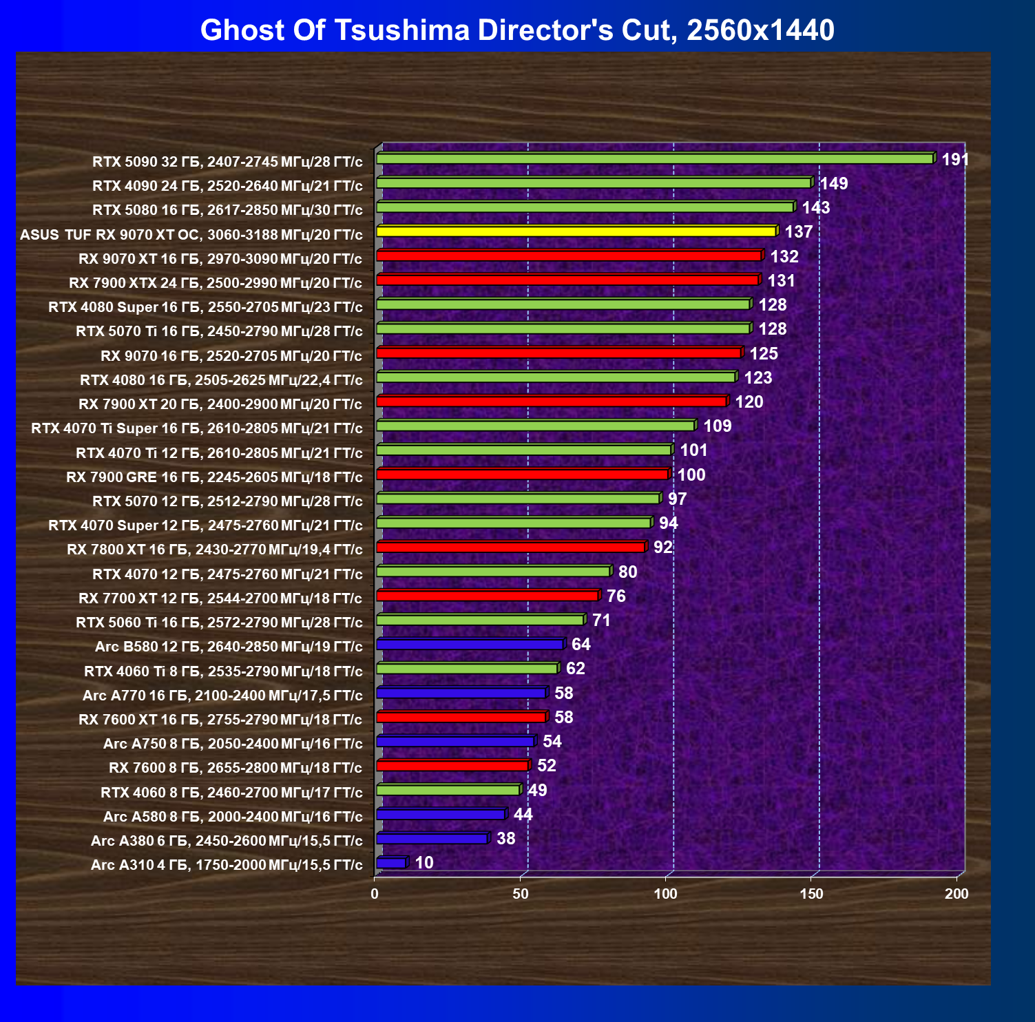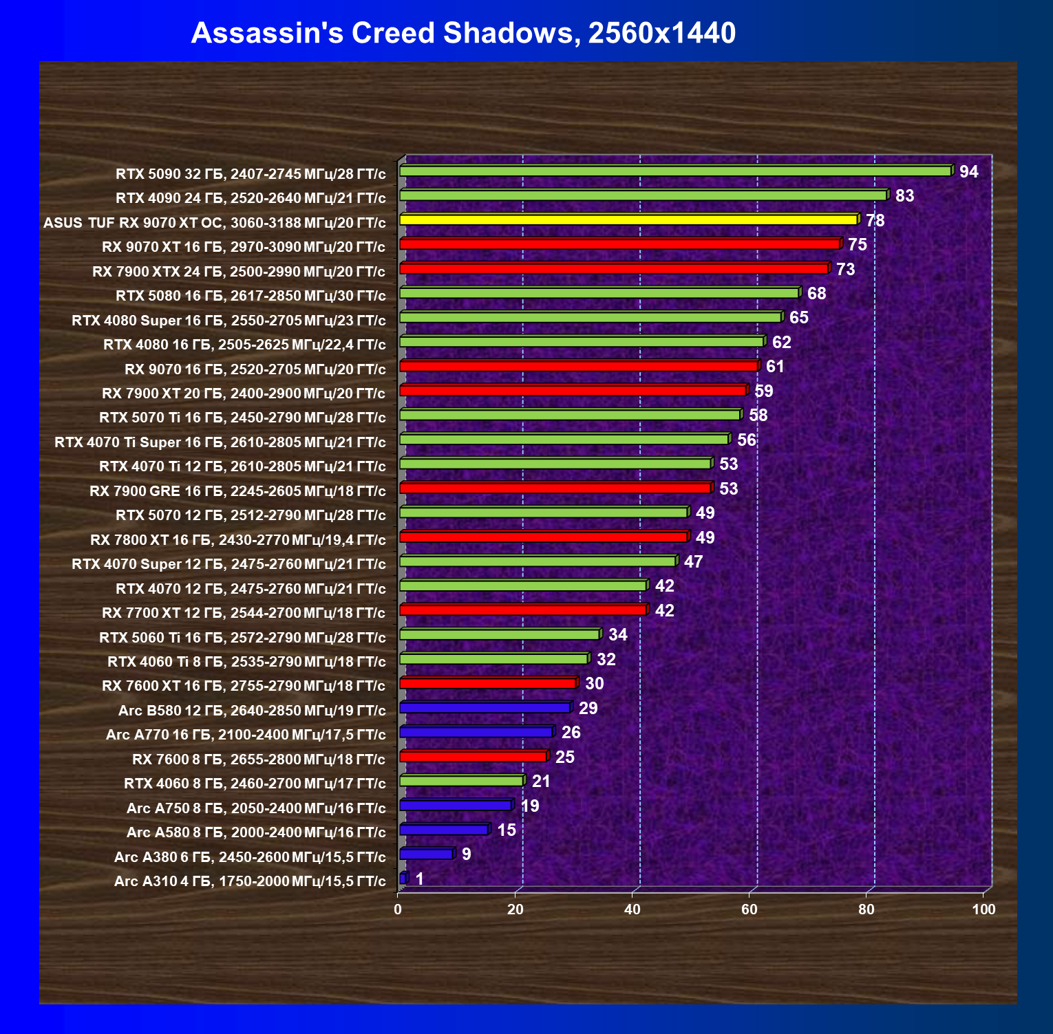 | 10 | Asus TUF RX 9070 XT OC, 3060—3188 МГц/20 ГТ/с | 487 | 4530 | 93 000 |