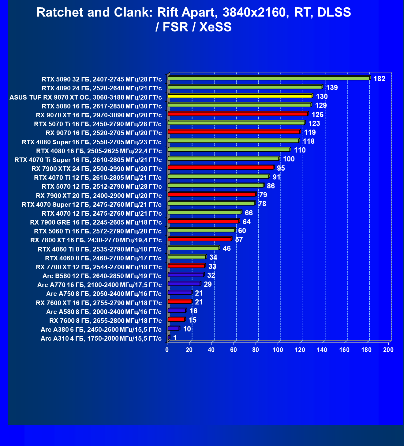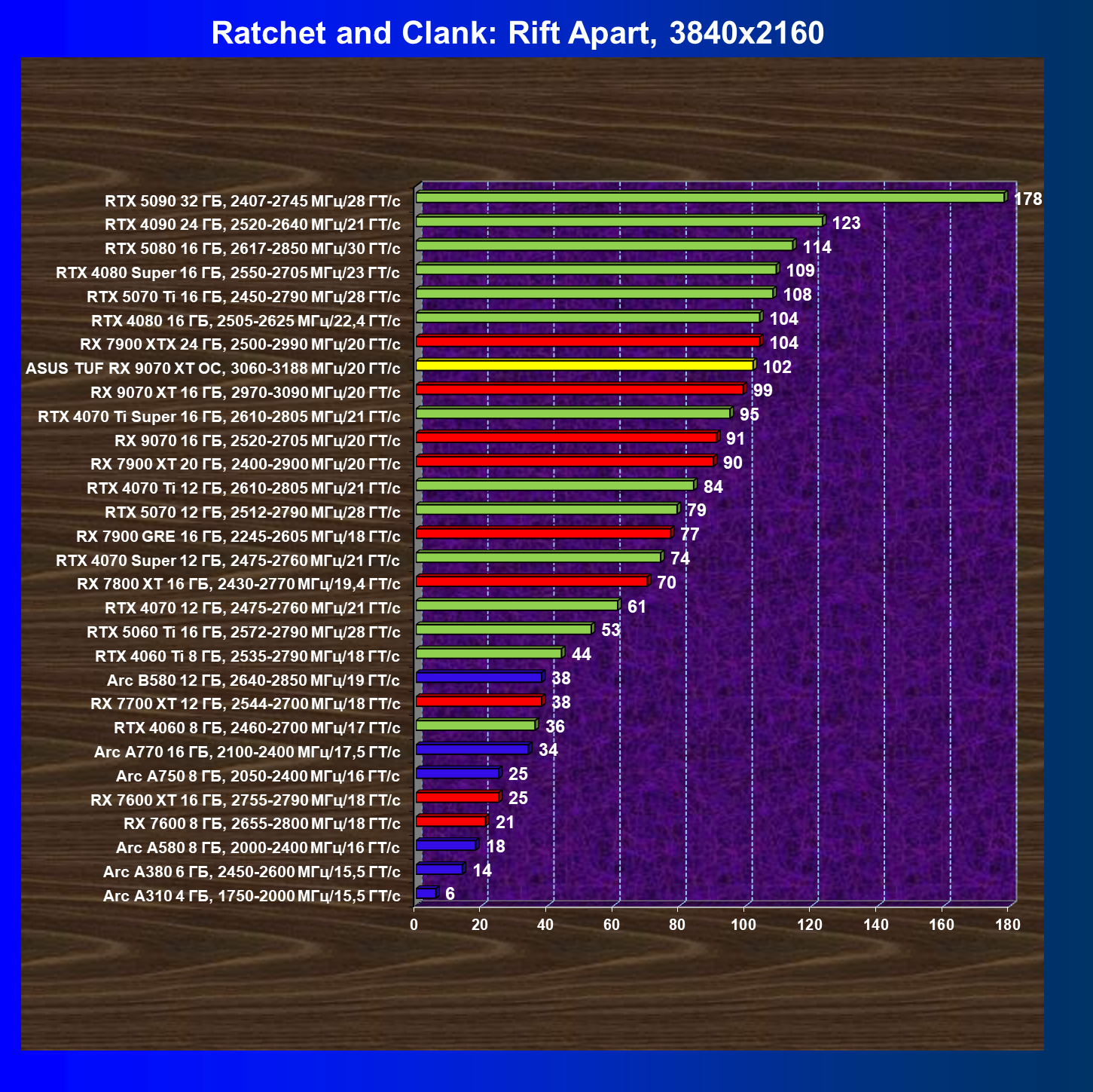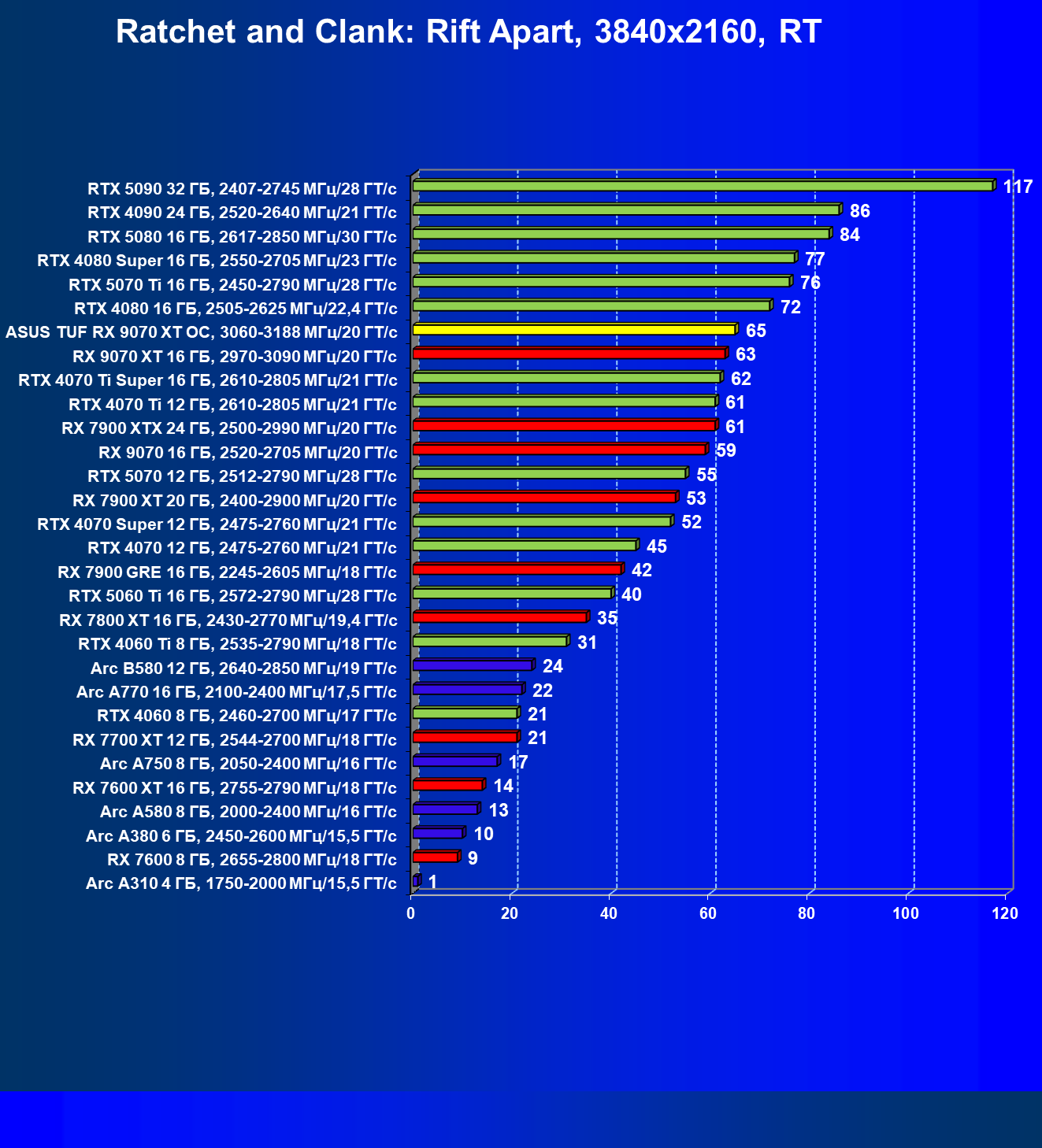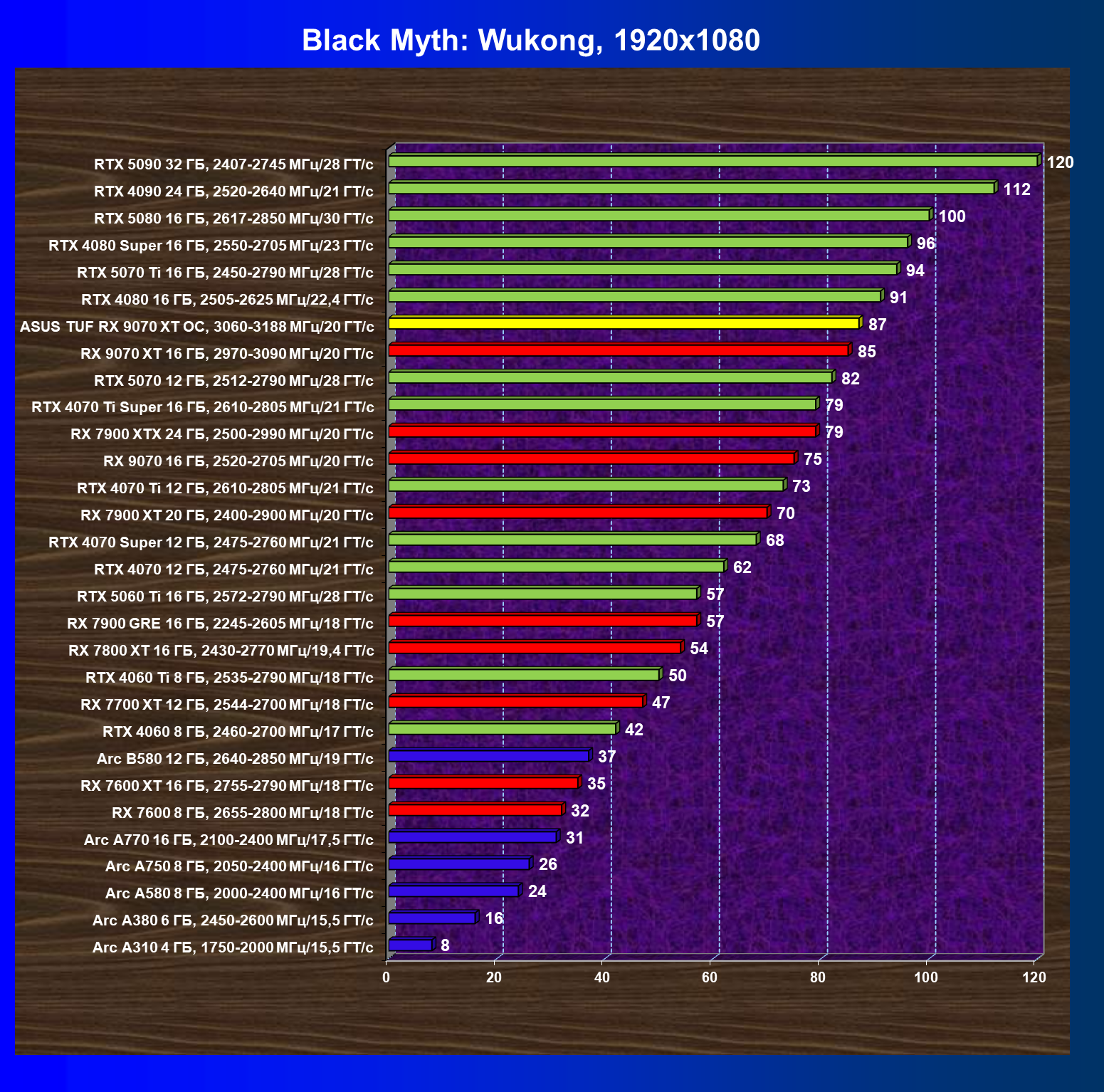 | 08 | Asus TUF RX 9070 XT OC, 3060—3188 МГц/20 ГТ/с | 242 | 2252 | 93 000 |