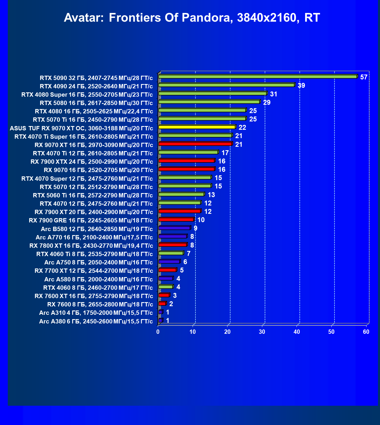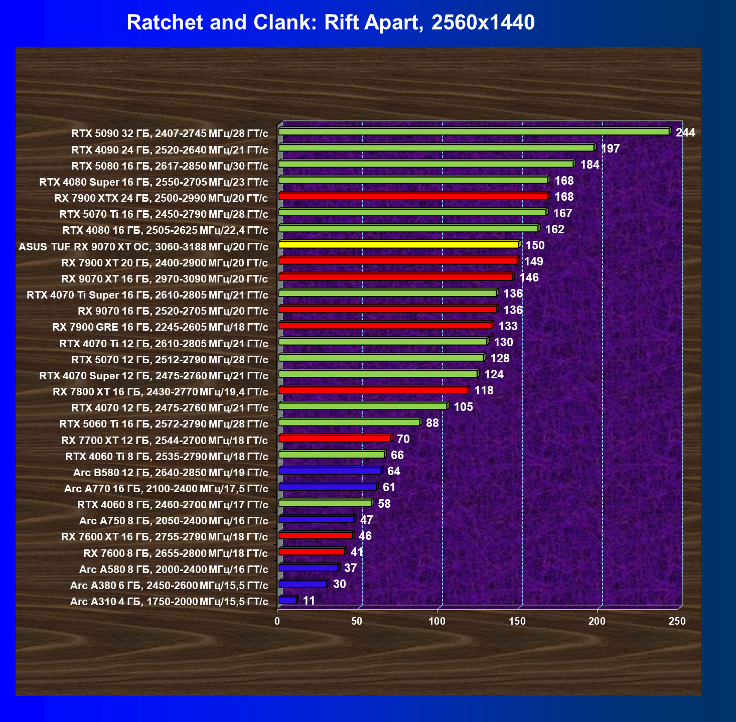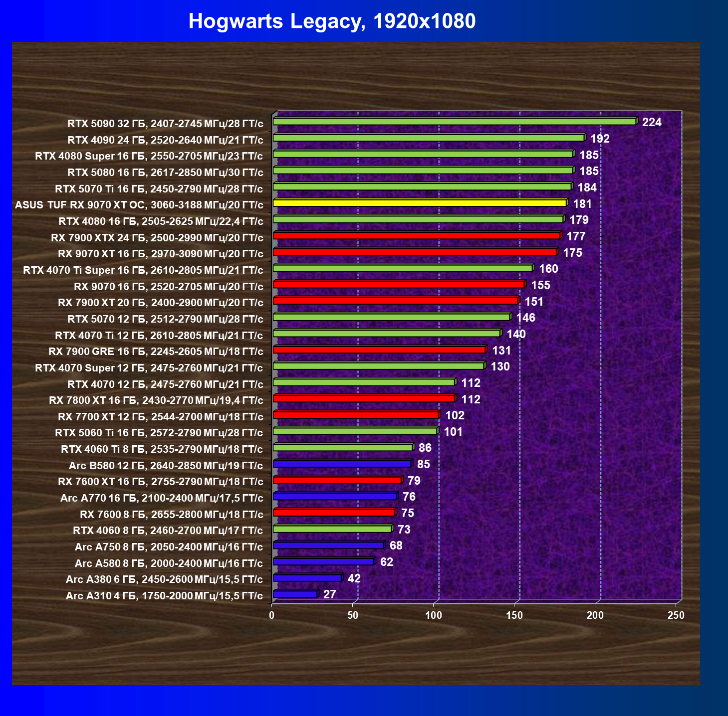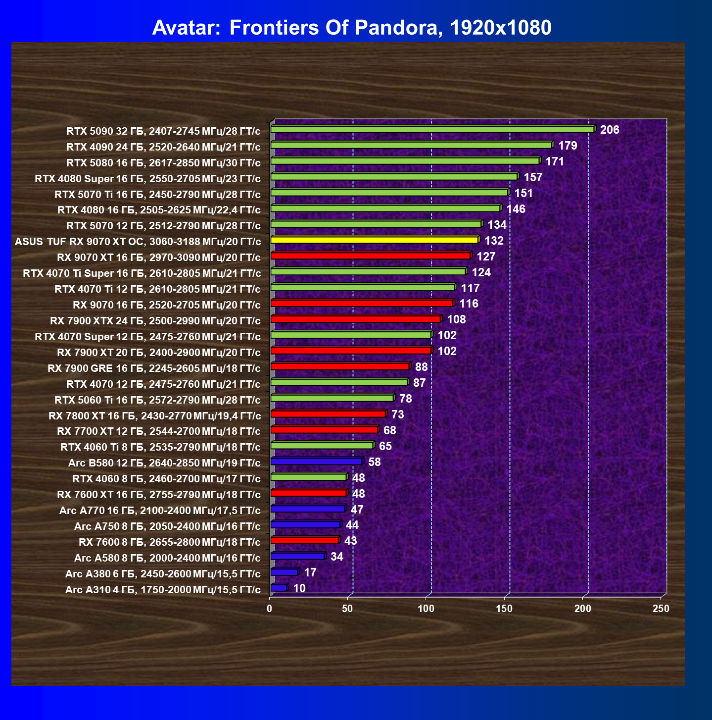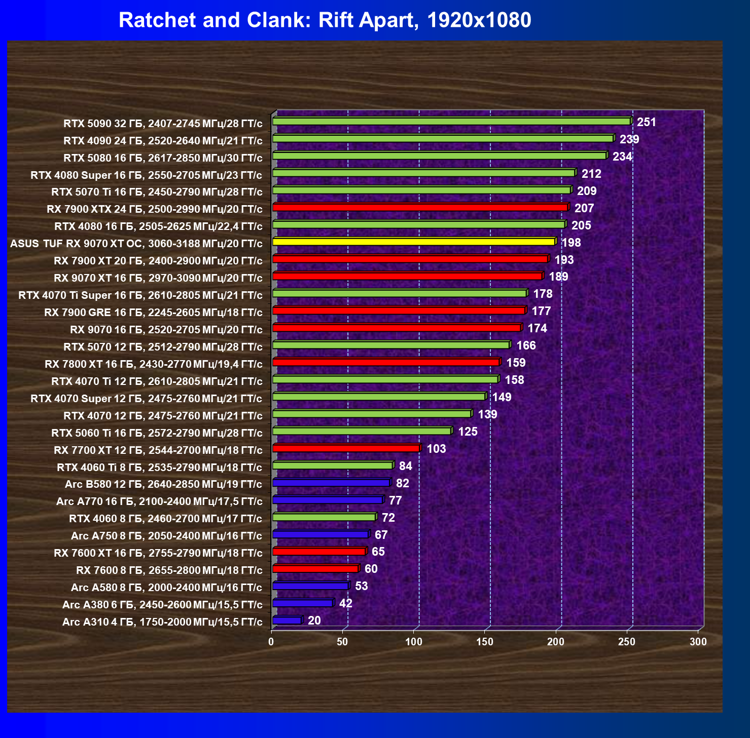 | 08 | Asus TUF RX 9070 XT OC, 3060—3188 МГц/20 ГТ/с | 242 | 2252 | 93 000 |