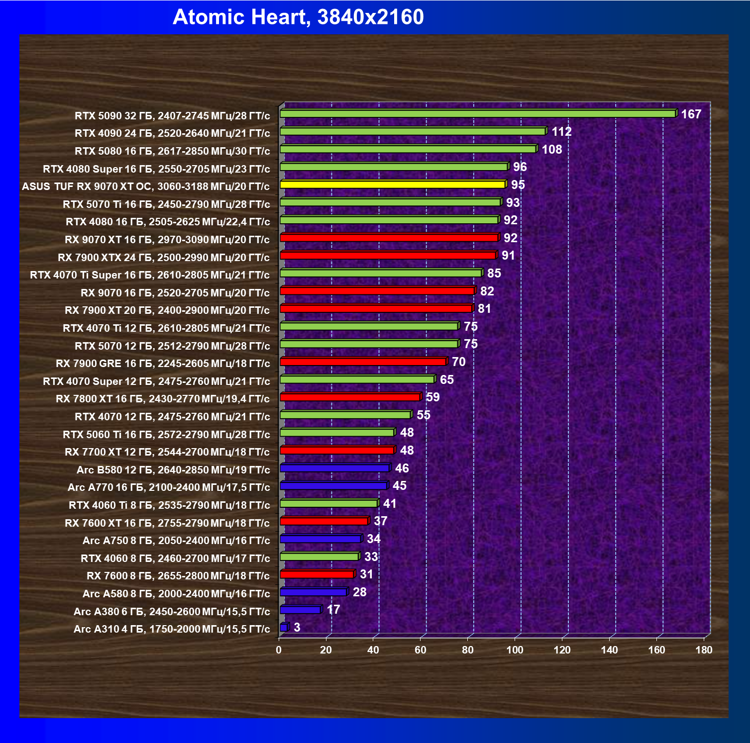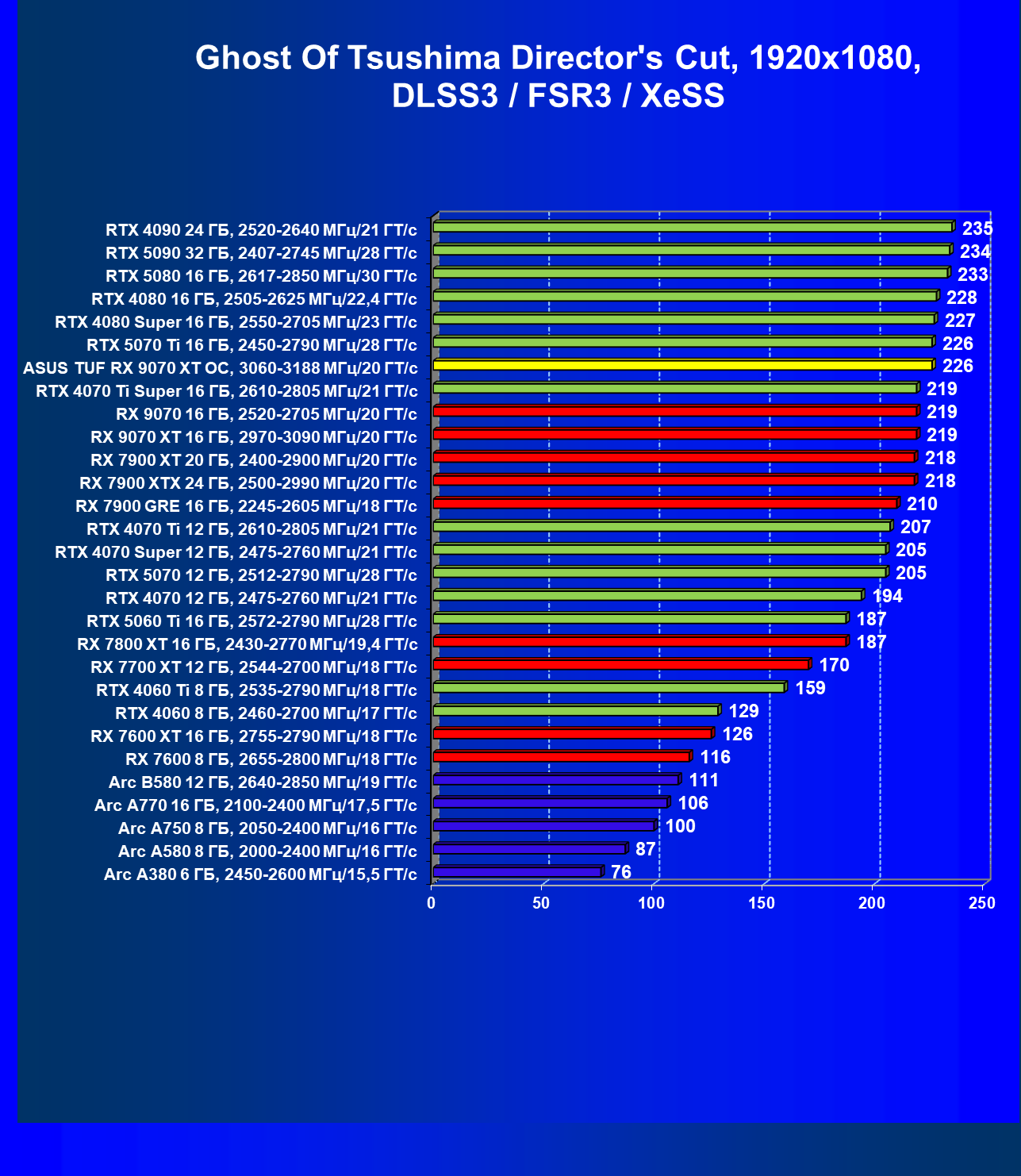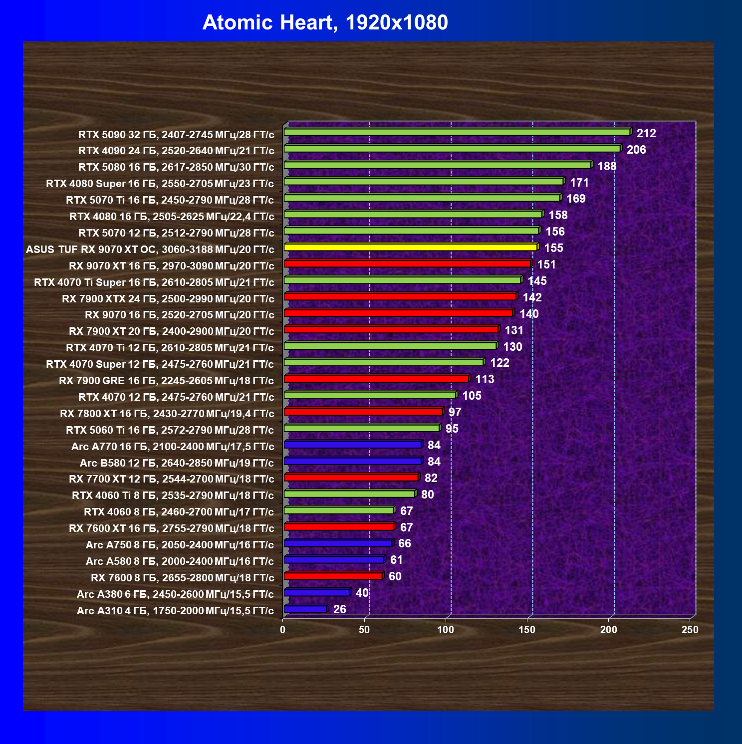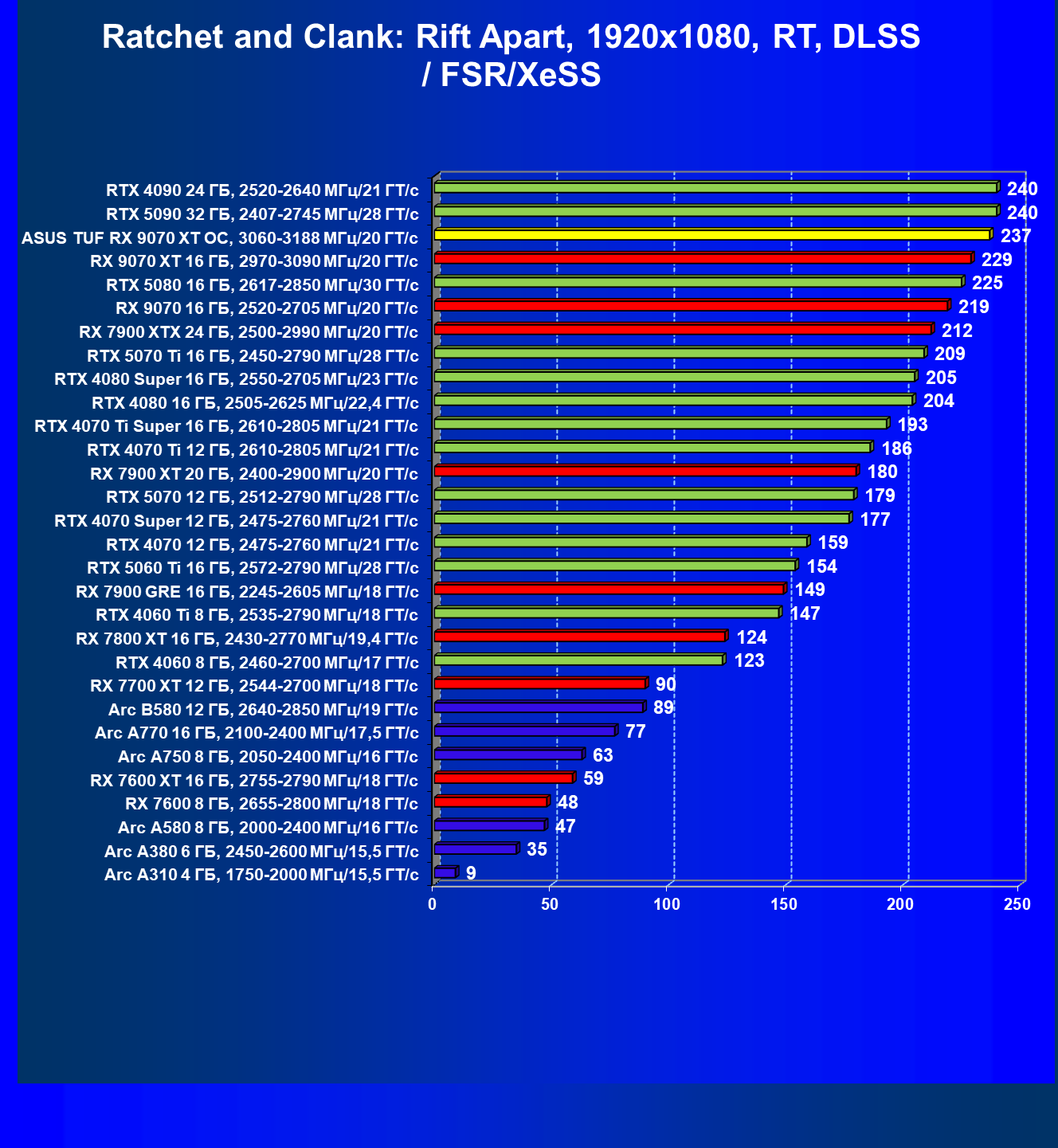 | 08 | Asus TUF RX 9070 XT OC, 3060—3188 МГц/20 ГТ/с | 242 | 2252 | 93 000 |