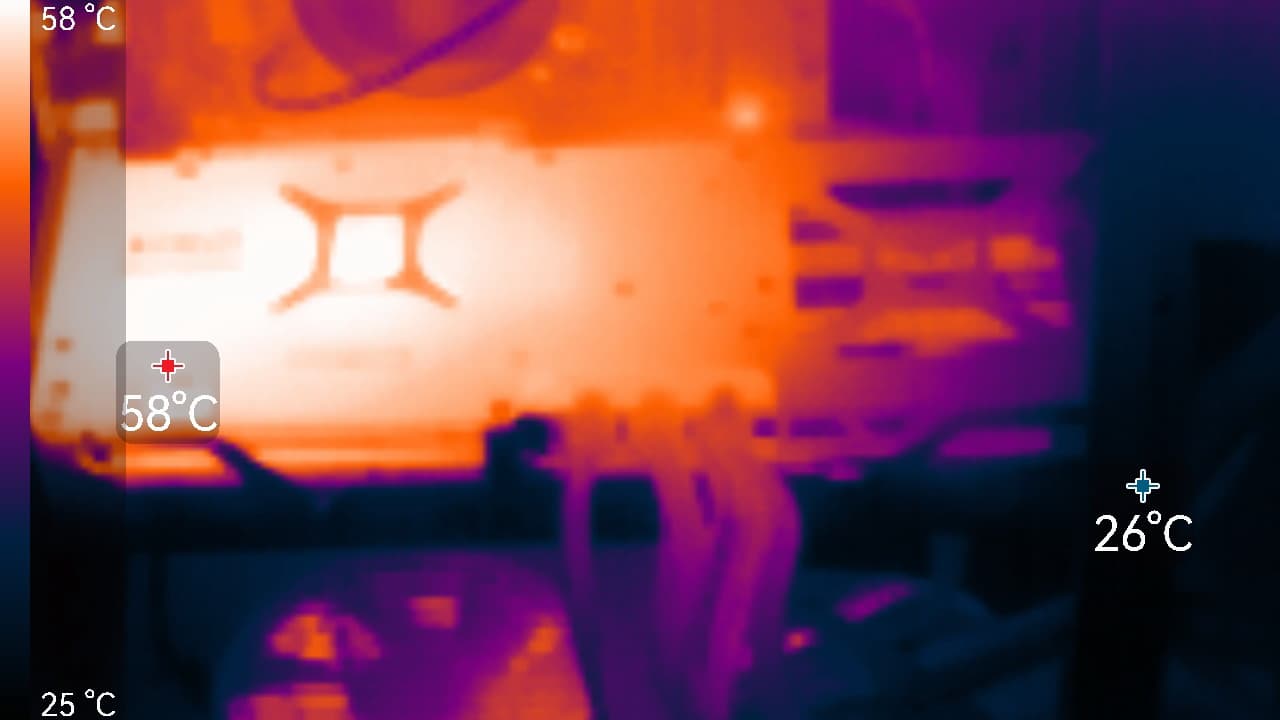 После прогона под нагрузкой максимальная температура ядра не превысила 58 градусов (hot spot — 90 °C), а микросхем памяти — 84 °C, что является отличным результатом. Энергопотребление карты доходило до 330 Вт.