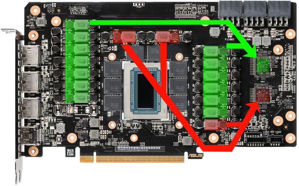 Суммарное количество фаз питания у карты Asus — 16 (13+3).