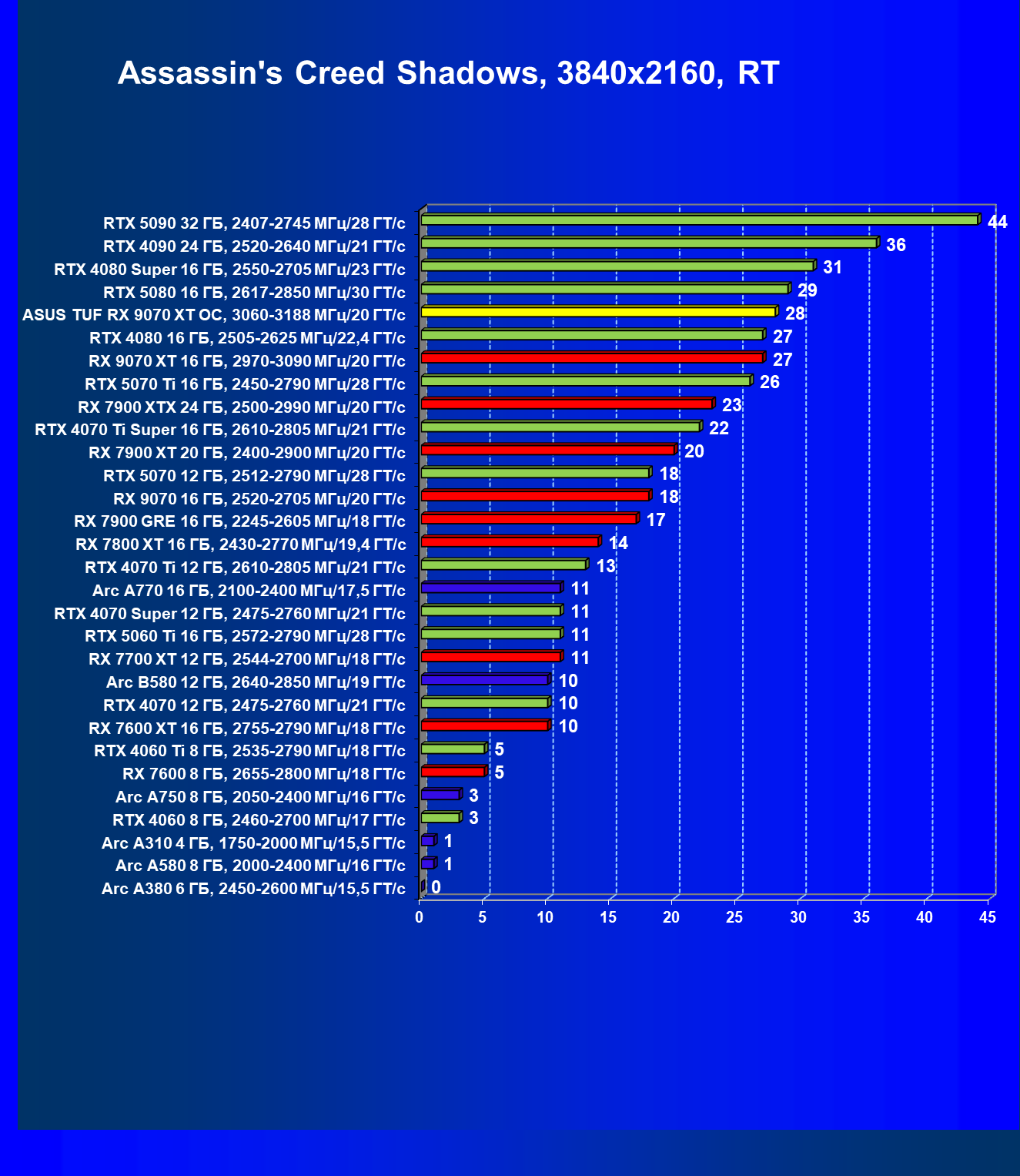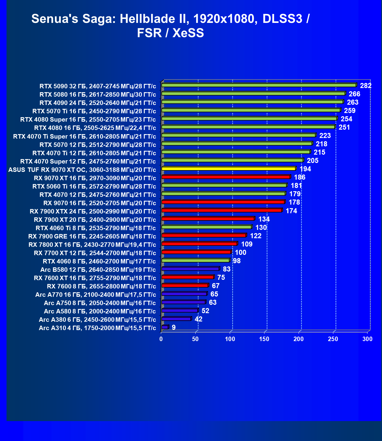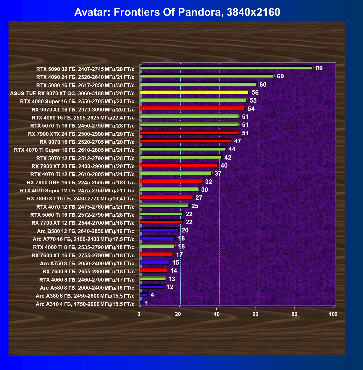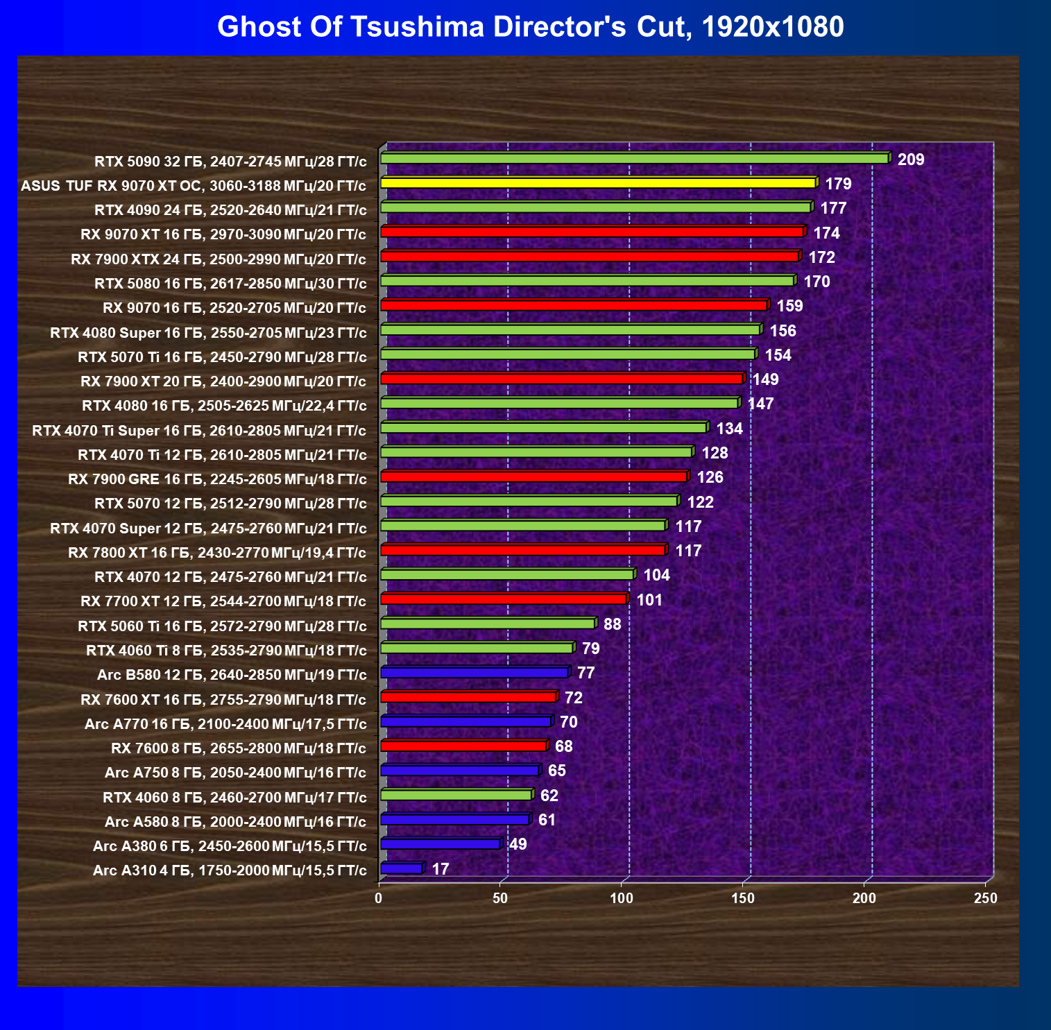 | 09 | RX 9070 XT 16 ГБ, 2970—3090 МГц/20 ГТ/с | 492 | 4377 | 89 000 |