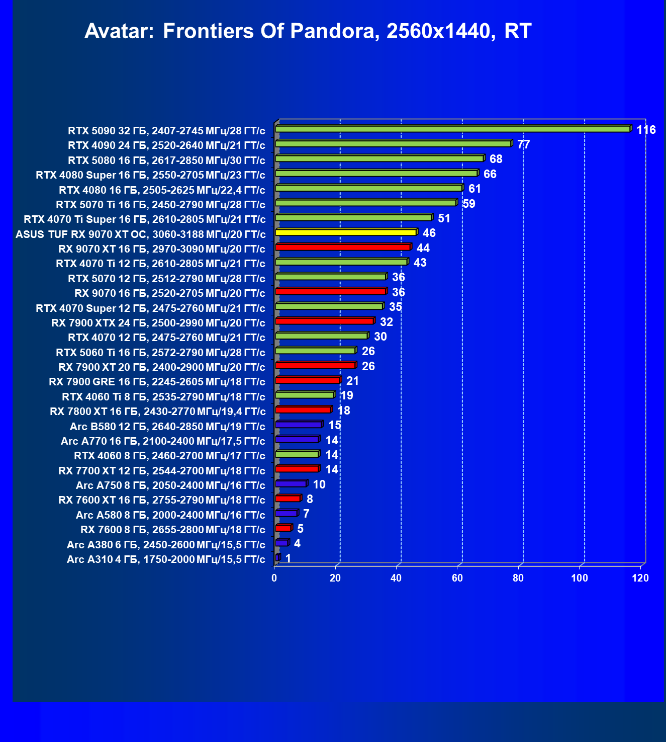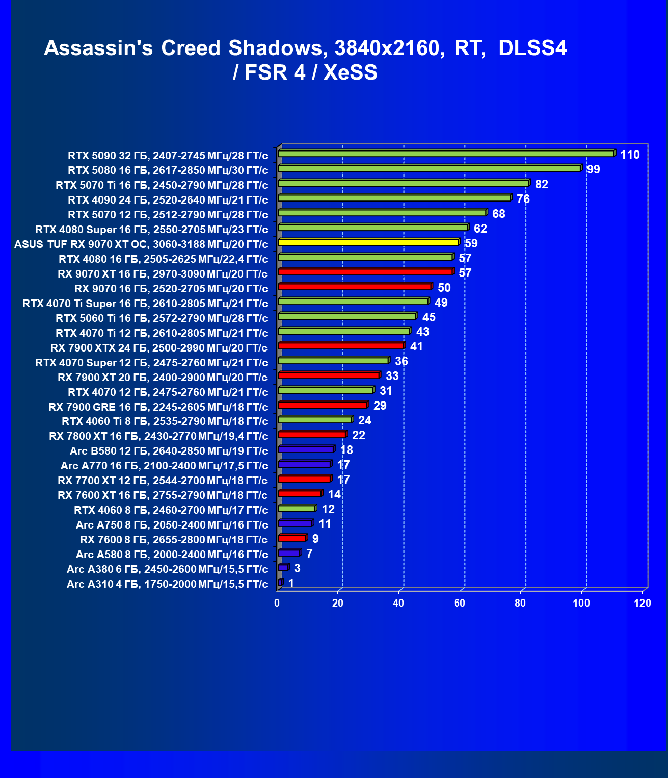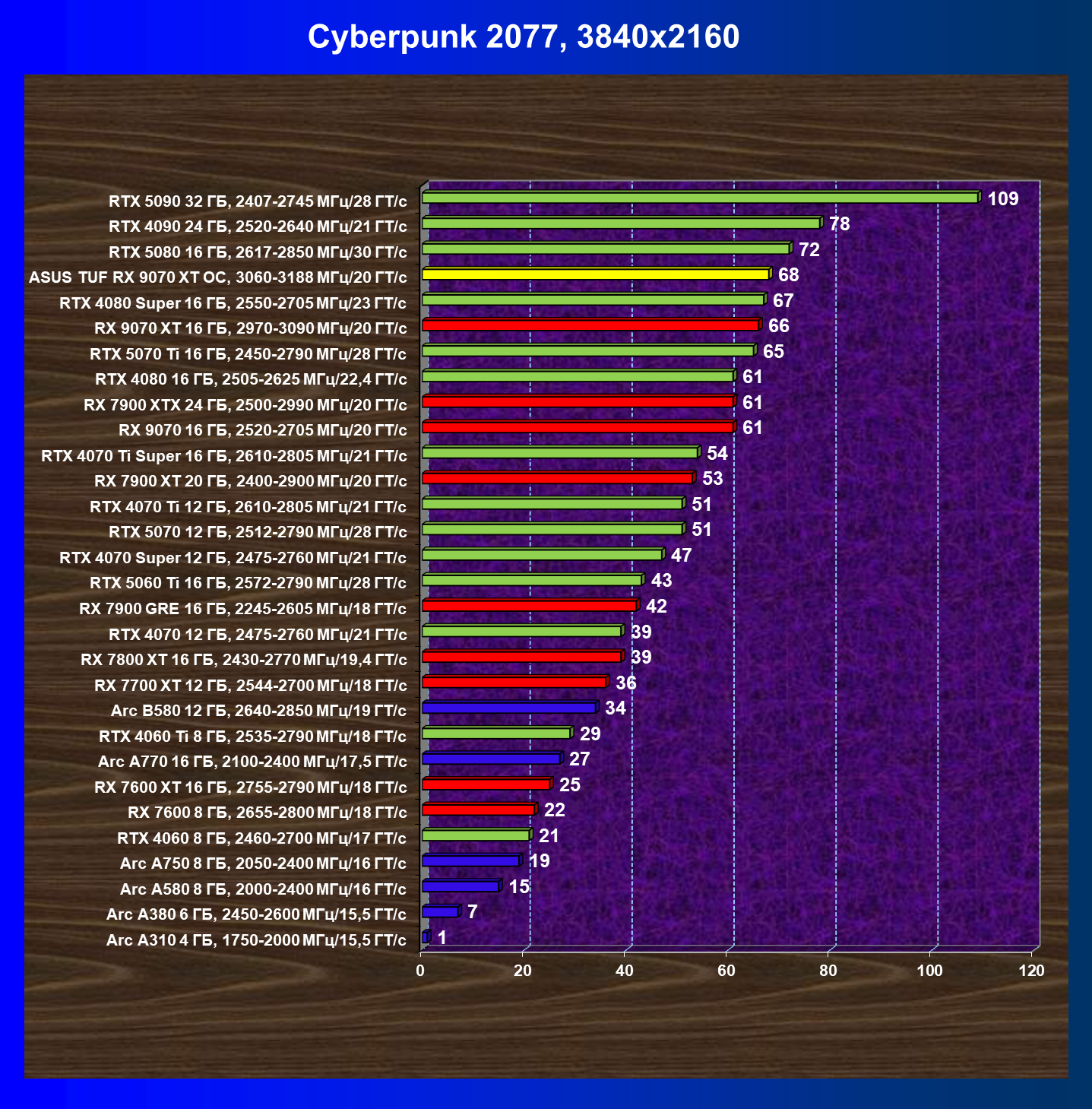 | 09 | Asus TUF RX 9070 XT OC, 3060—3188 МГц/20 ГТ/с | 4530 | 487 | 93 000 |