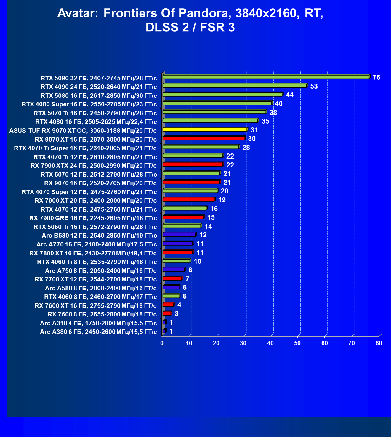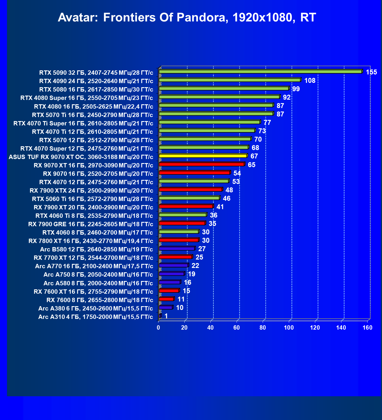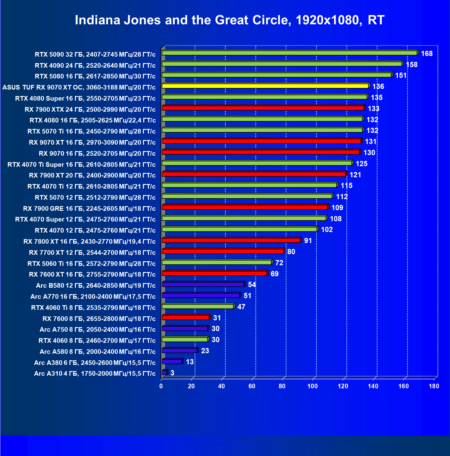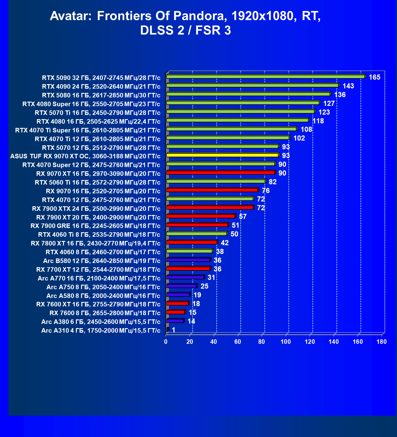 | 09 | Asus TUF RX 9070 XT OC, 3060—3188 МГц/20 ГТ/с | 4530 | 487 | 93 000 |