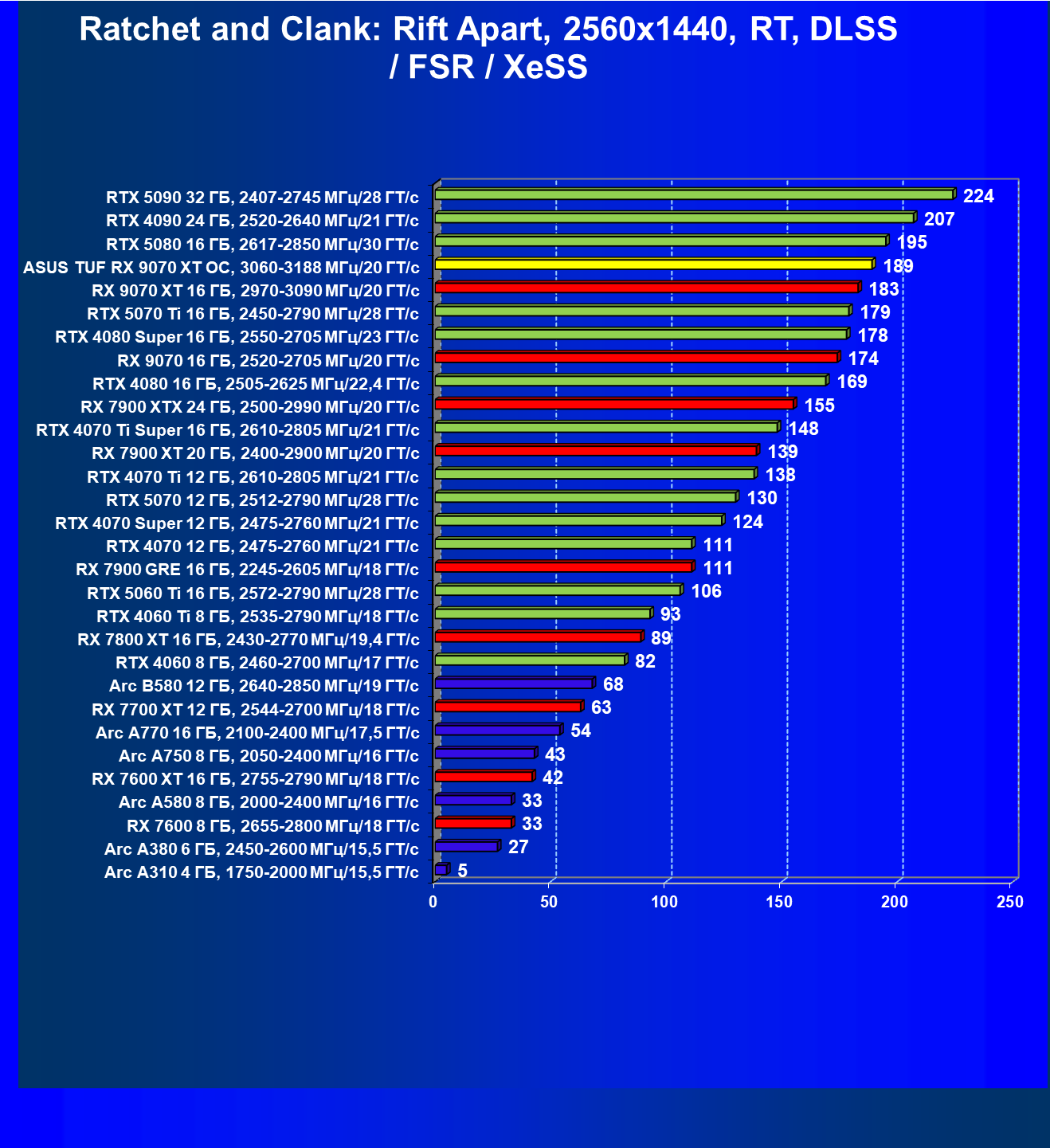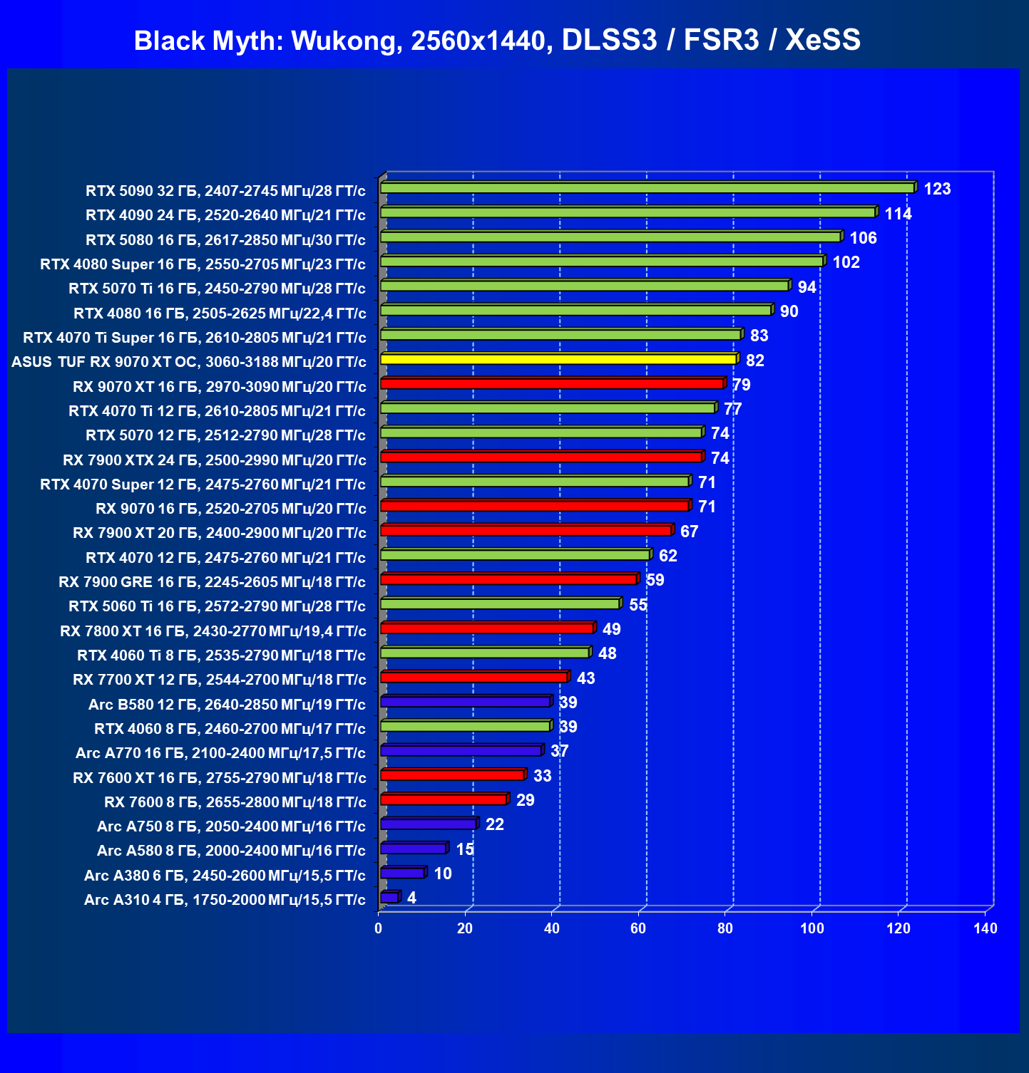 В играх с активной трассировкой лучей и разными видами апскейлинга (FSR/XeSS) Radeon RX 9070 XT находится на одном уровне с GeForce RTX 4070 Ti, чуть выше GeForce RTX 4070 Super и весьма существенно опережает флагмана предыдущего поколения Radeon RX 7900 XTX. В разрешениях до 2.5K включительно можно получить хороший комфорт в играх на высоких настройках графики, а во многих играх приемлемая производительность будет и в 4K, однако в некоторых играх использование трассировки лучей надо сочетать с технологиями динамического масштабирования).