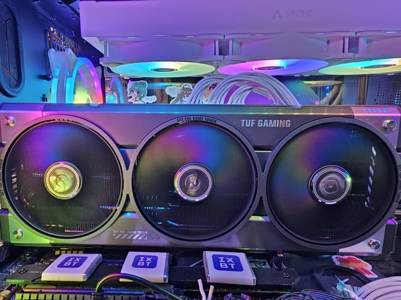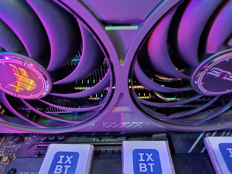 Протестированная карта Asus имеет мощную и эффективную СО, которая становится тихой в режиме BIOS Q mode. Однако из-за такого кулера карта весьма массивная и имеет приличные размеры: 33 см в длину, 14 см в высоту, де-факто 4 слота по толщине. Набор видеовыходов стандартный: 3 DP 2.1b и 1 HDMI 2.1b. Карта обладает простой и скромной подсветкой, которую можно синхронизировать с материнскими платами Asus через приложение Armoury Crate. Максимальная потребляемая мощность составляет 330 Вт, питание осуществляется через три 8-контактных разъема версии PCIe 2.0.