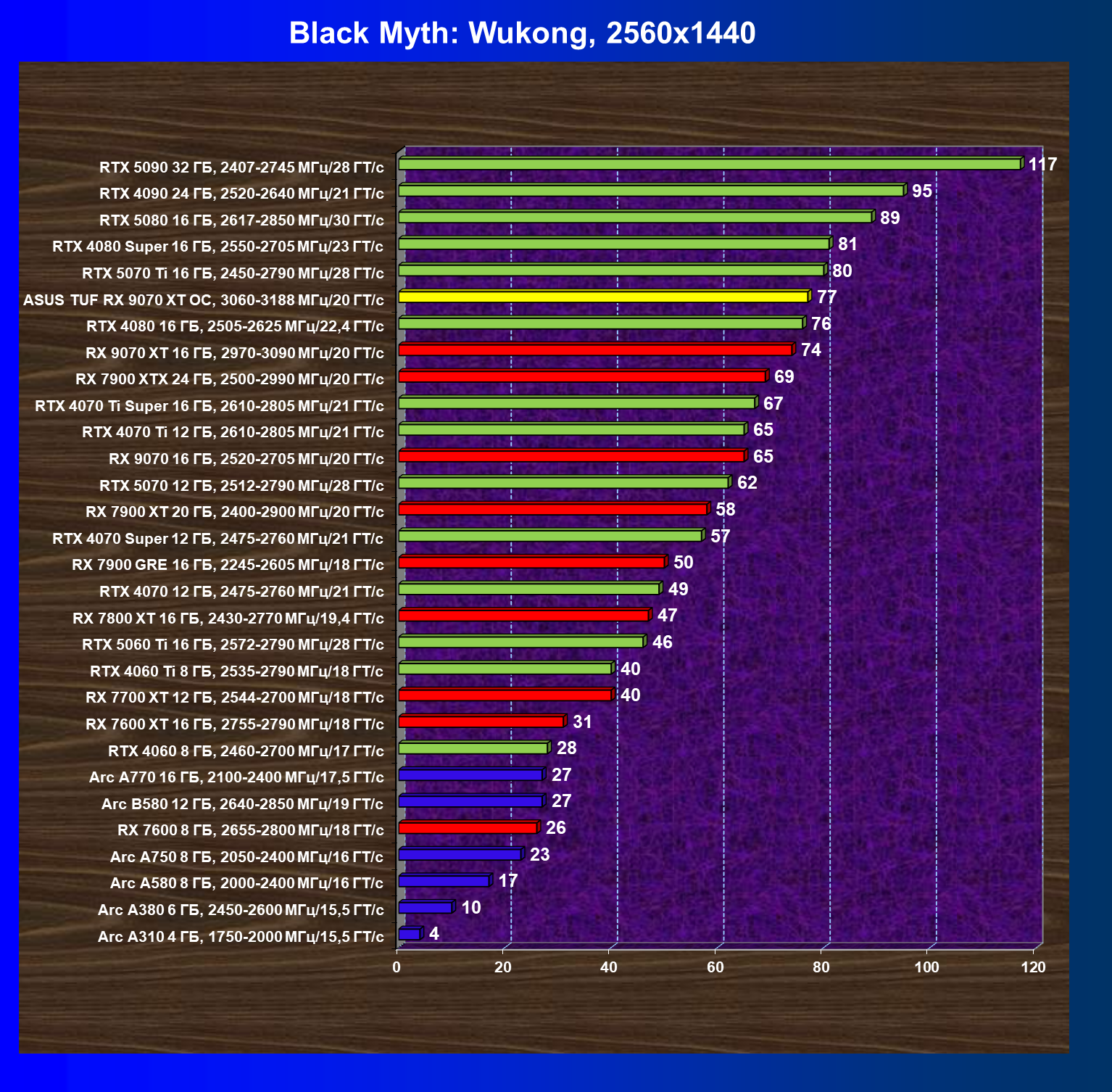 | 06 | RTX 5070 Ti 16 ГБ, 2450—2790 МГц/28 ГТ/с | 2186 | 221 | 99 000 |