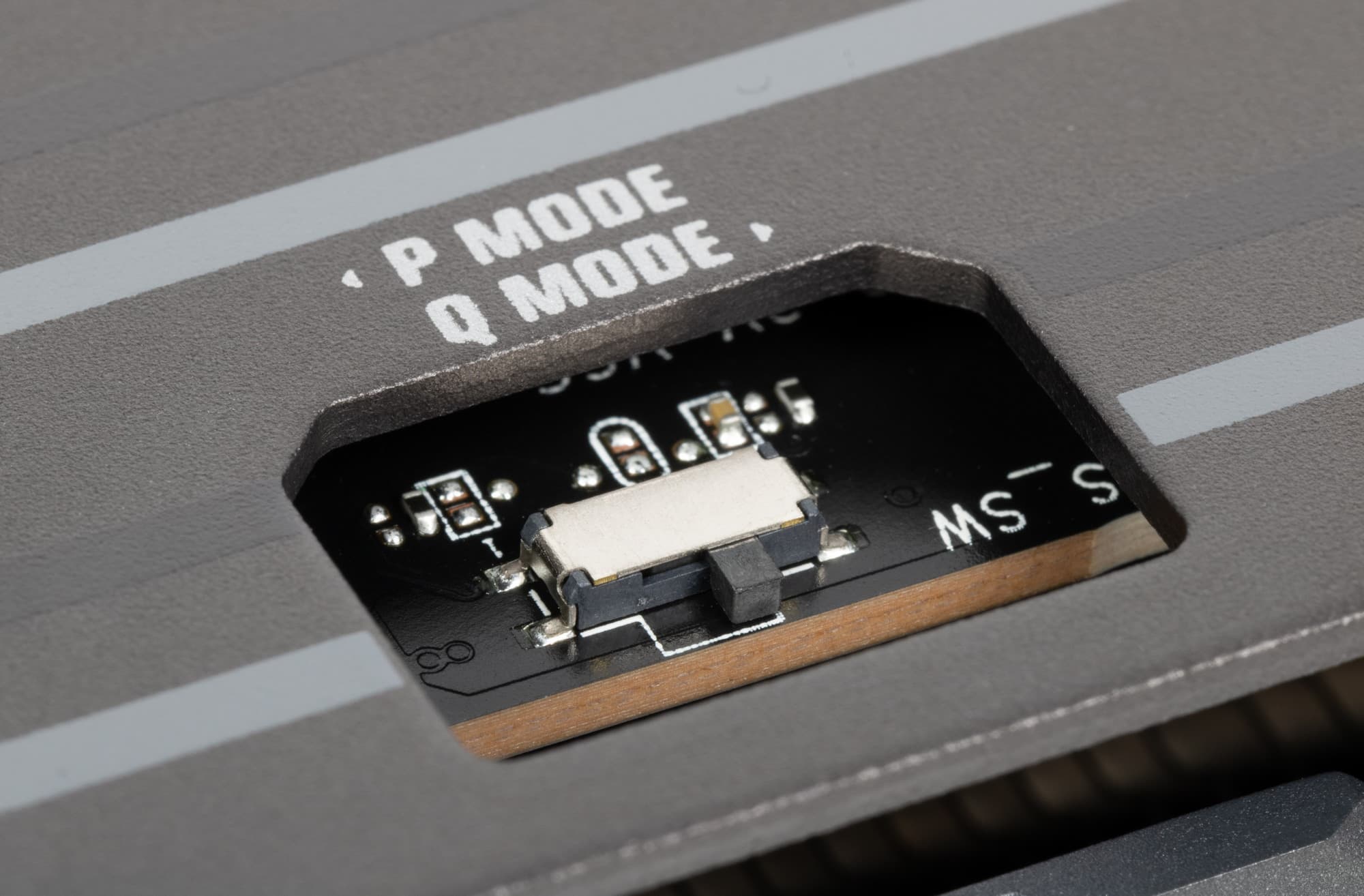 Карта имеет два режима работы, они заложены в двух вариантах BIOS, которые переключаются с помощью переключателя на переднем торце карты: P (performance / производительный) и Q (Quiet / тихий). Разница между режимами заключается, по сути, только в оборотах вентиляторов, предел энергопотребления в обоих случаях составляет 350 Вт.