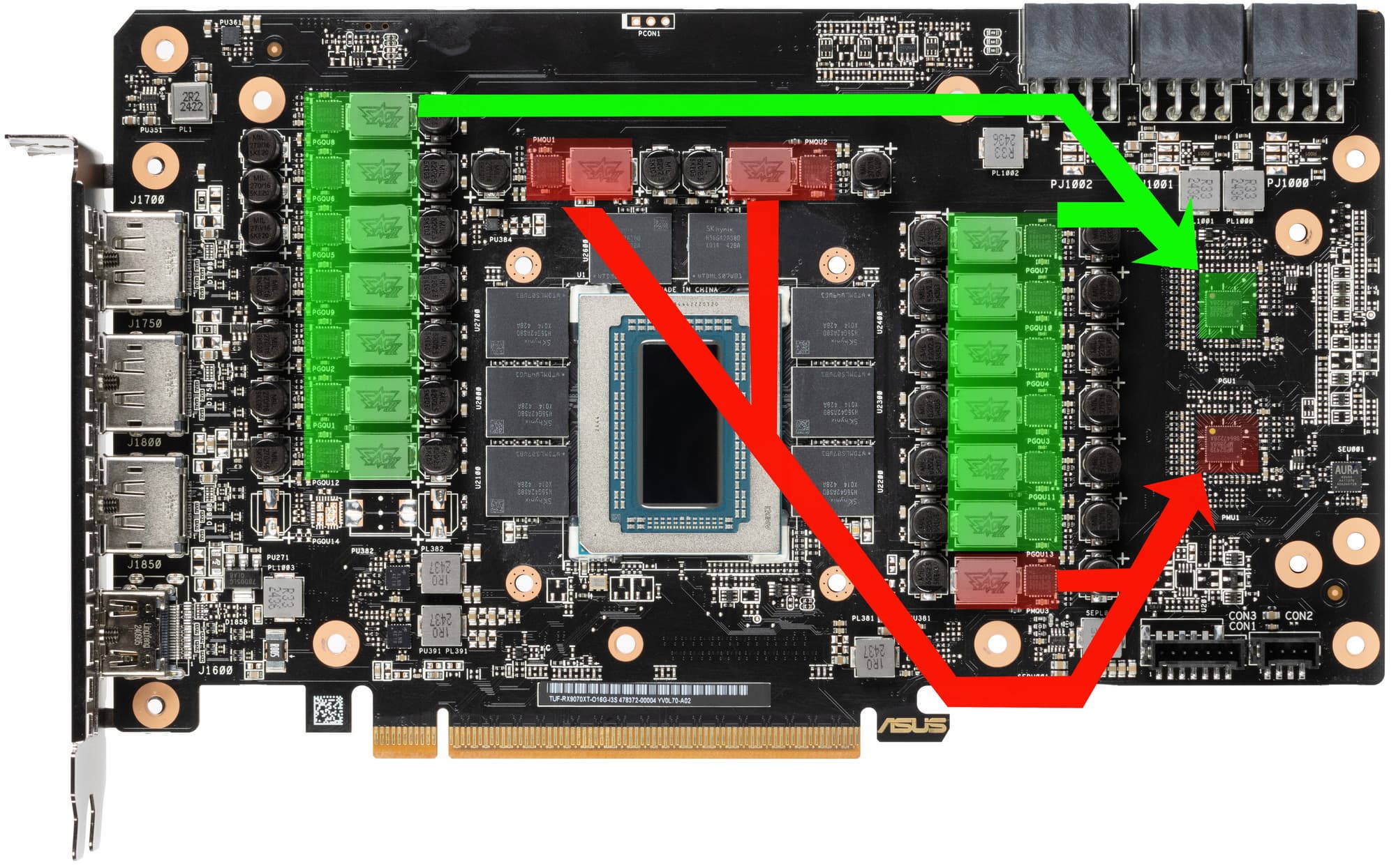 Зеленым цветом отмечена схема питания ядра (13 фаз), красным — памяти (3 фазы).