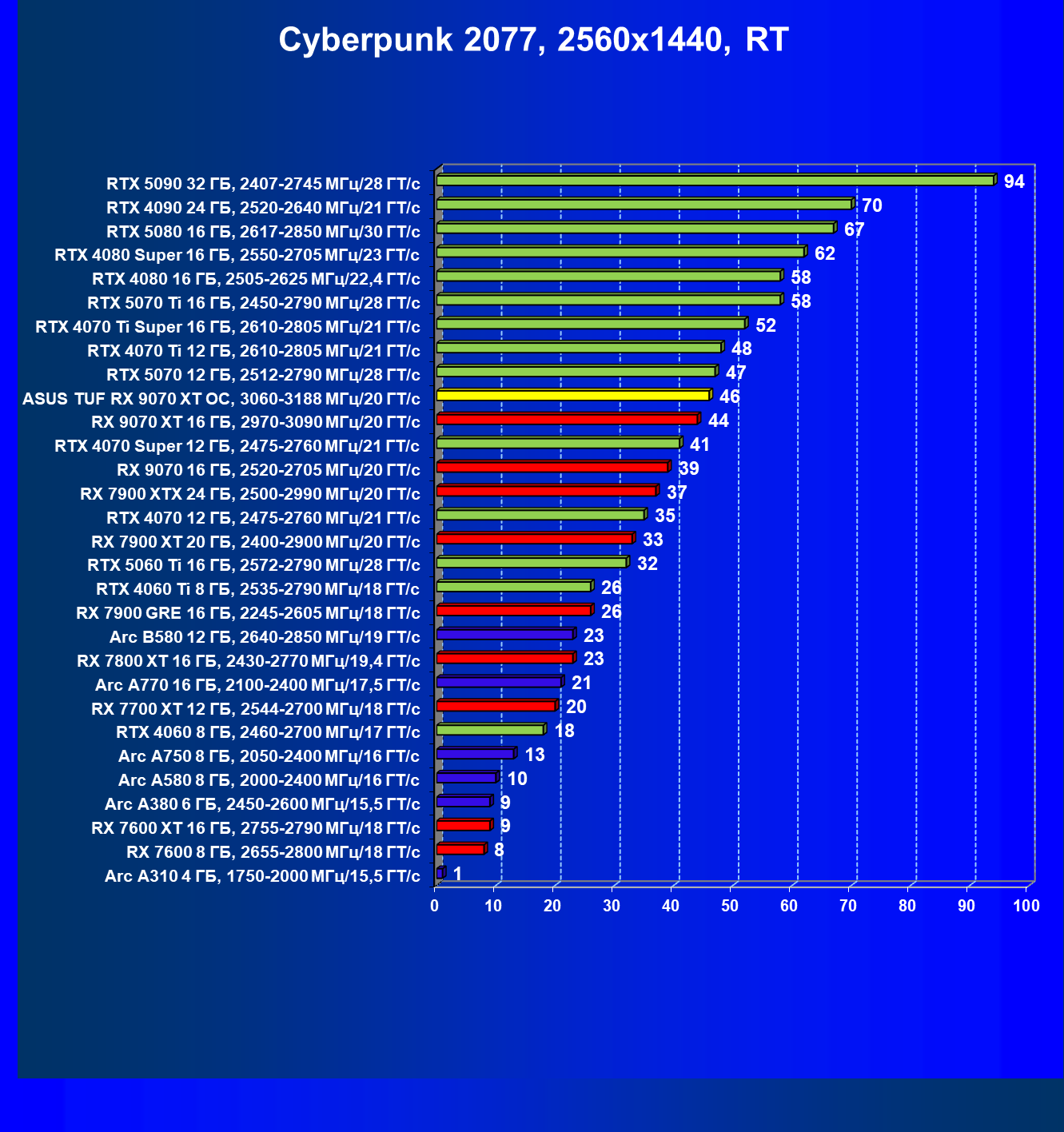 | 07 | RX 9070 XT 16 ГБ, 2970—3090 МГц/20 ГТ/с | 244 | 2168 | 89 000 |