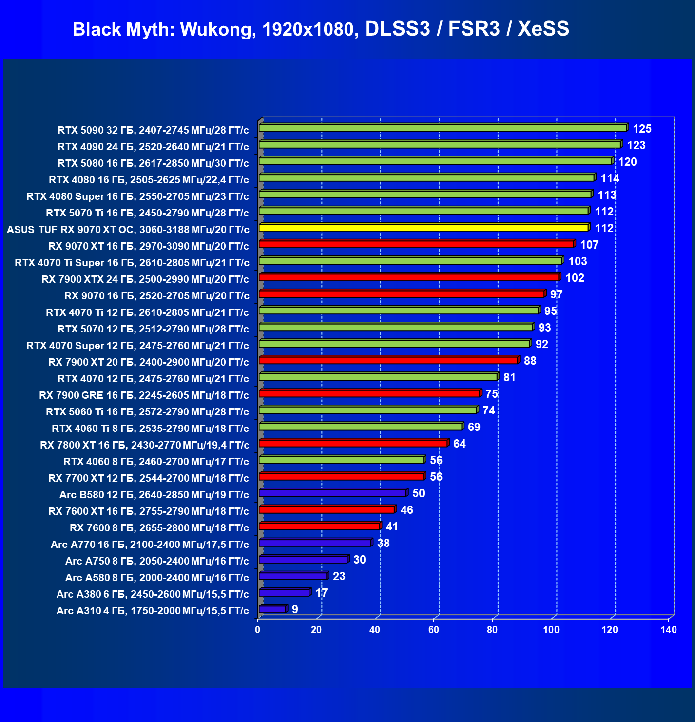 Еще раз отметим, что в классических играх Radeon RX 9070 XT может обеспечить высокий уровень комфорта в играх на максимальных настройках качества во всех разрешениях до 4K включительно. В играх с активной трассировкой лучей и разными видами апскейлинга (FSR/XeSS) Radeon RX 9070 XT позволит получить хороший комфорт в играх на высоких настройках графики в разрешениях до 2.5K включительно, а во многих играх приемлемая производительность будет и в 4K, однако в некоторых играх использование трассировки лучей надо сочетать с технологиями динамического масштабирования).