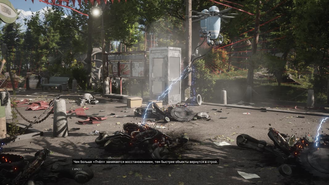 Путешествие за героя Майора Нечаева — в радость, благодаря отличной, живой и натуральной озвучке, в которой даже присутствуют матерные слова, они, конечно, не всегда к месту, но это позволяет максимально сопереживать за героя и ко многим событиям относиться с пониманием и верой в происходящую катастрофу. Наша «супер-рука» тоже приятно вещает свои мысли и подсказки, и сами того не замечая, мы ощущаем, что в этом мире кроме восставших роботов, нас, Бабы Зины и еще горстки выживших людей, которых мы редко встречаем, есть еще помогающий нам виртуальный компаньон.