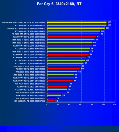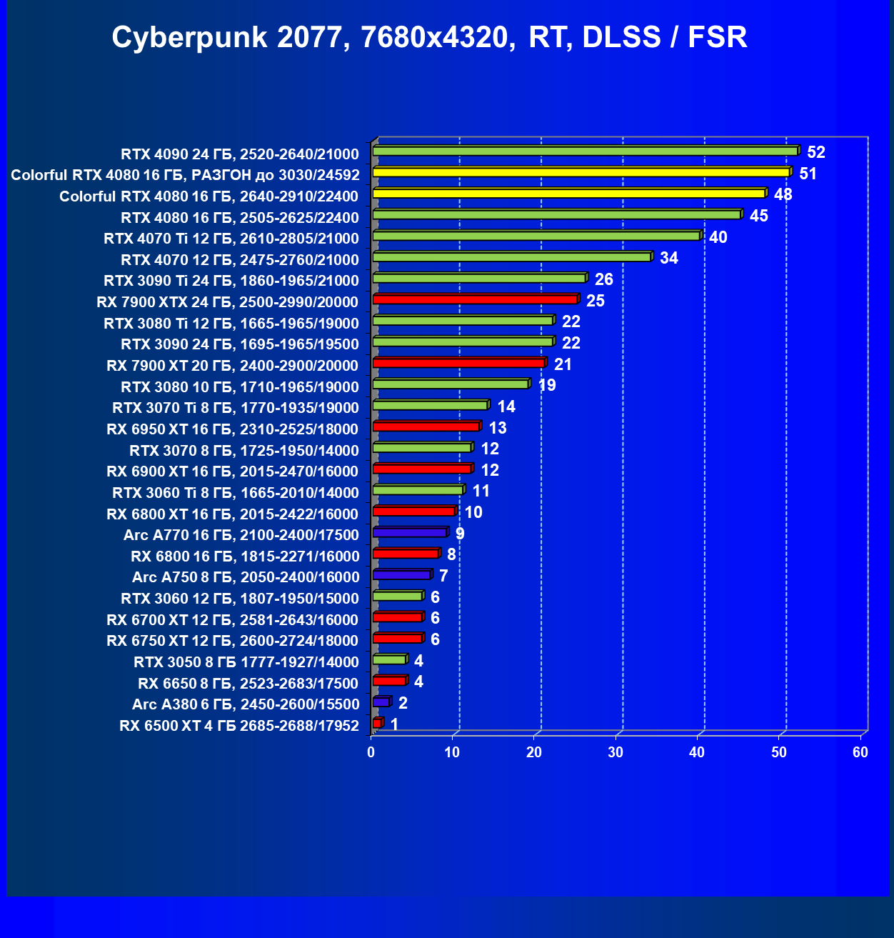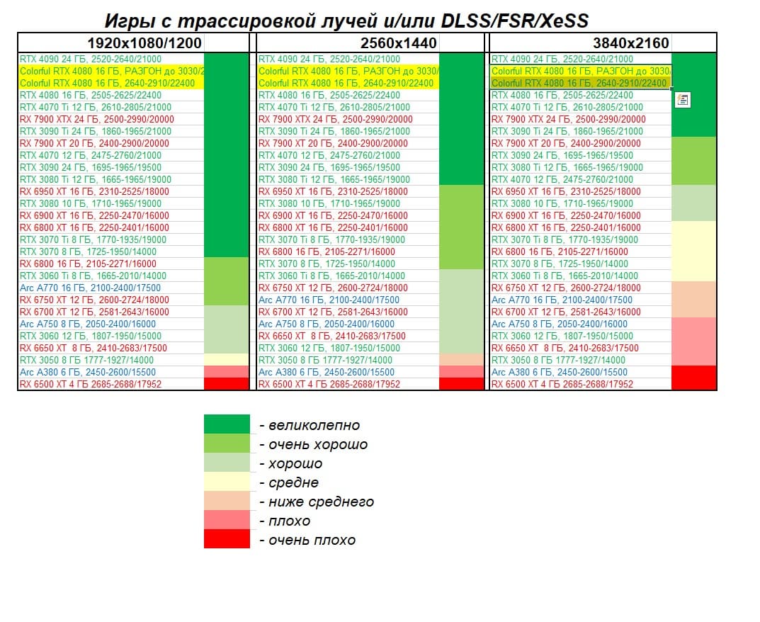 Почти все вышесказанное справедливо и здесь, за исключением того, что RTX 4070 Ti вырвался вперед, из-за своей меньшей стоимости, но при этом приходится жертвовать производительностью. Из-за своей навороченности по СО и комплекту поставки карта Colorful дороже, чем средневзвешенная RTX 4080, поэтому в рейтинге первая отстает от второй (наши рейтинги учитывают только производительность и стоимость). При этом даже несмотря на то, что такая карта сильно дороже как RX 7900 XTX, так и 7900 XT, за счет отличной производительности с рейтрейсингом и наличия поддержки DLSS 3.0, карта Colorful выглядит предпочтительнее к приобретению, нежели конкуренты из стана «красных».