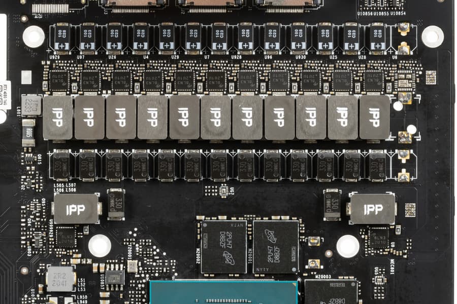 В преобразователе питания, традиционно для всех видеокарт Nvidia, используются транзисторные сборки DrMOS — в данном случае AOZ5334UQI (Alpha&Omega Semiconductor), каждая из которых рассчитана максимум на 55 А.