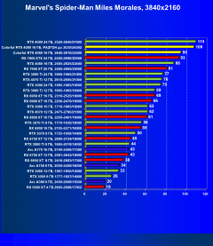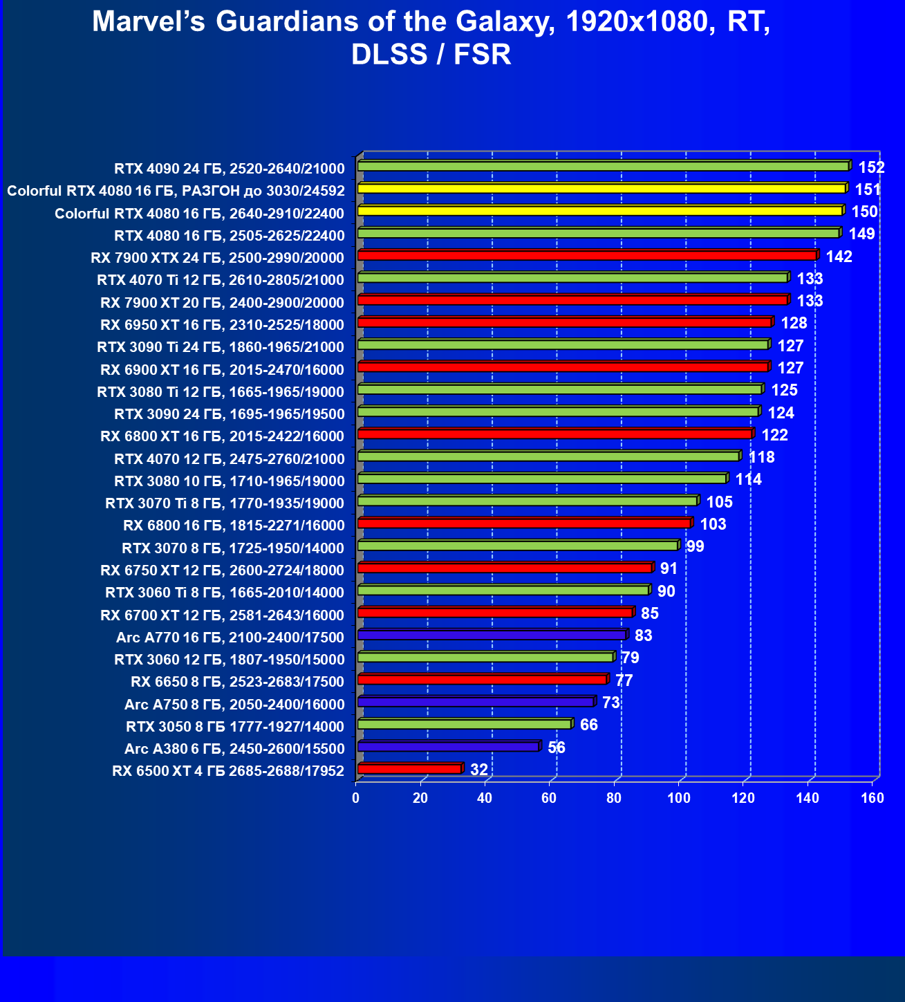 Полагаем, что долгих комментариев не требуется — и так понятно, что RTX 4080 — примерно там же, где и RTX 4090, во всех трех разрешениях его значок наверху (только в разрешении 4K формально чуть ниже). Что касается карты Colorful, то у нее частоты выше чем у референс-аналога, что дает прирост производительности в 5%-6%, а ручной разгон позволяет поднять производительность еще выше, приближая данный ускоритель к RTX 4090.