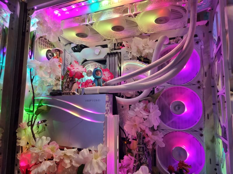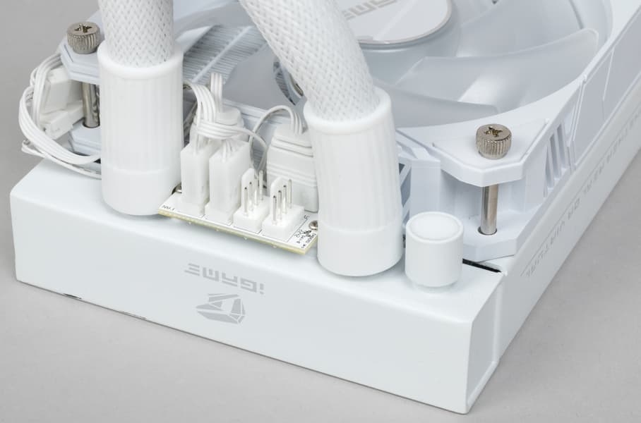 На выносном радиаторе СЖО установлено три вентилятора ∅120 мм, имеющих по 7 прозрачных лопастей, оснащенные ARGB-подсветкой.
