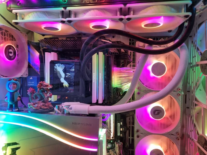 Вентиляторы уже подключены по питанию и подсветке, провода спрятаны в оплетку шлангов, поэтому в целом СЖО смотрится очень аккуратной.