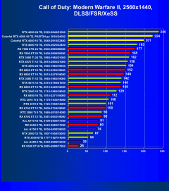 Рейтинг составлен по 9 тестам, в которых используется технология трассировки лучей и одновременно технология Nvidia DLSS, Intel XeSS или AMD FSR. Этот рейтинг нормирован по самому слабому ускорителю в данной группе — Radeon RX 6500 XT (то есть сочетание скорости и функций Radeon RX 6500 XT приняты за 100%).