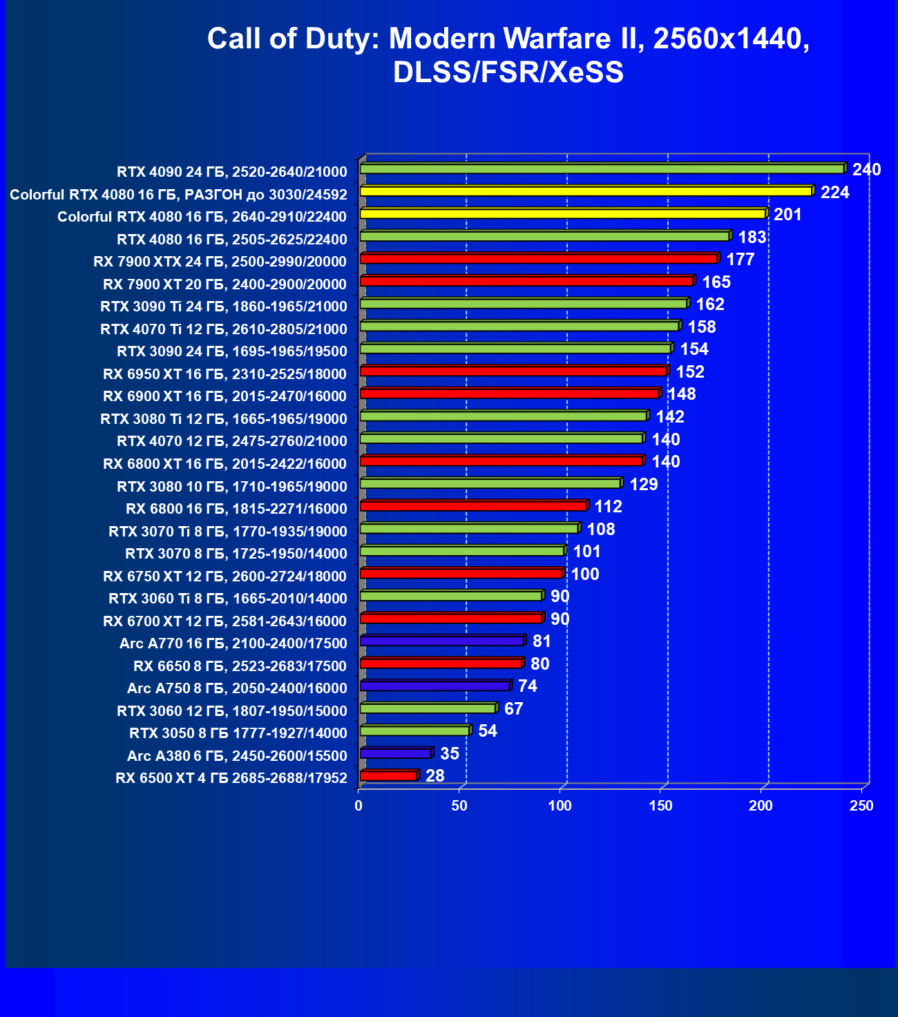 | 07 | Colorful RTX 4080 16 ГБ, 2640—2910/22400 | 181 | 1989 | 110 000 |