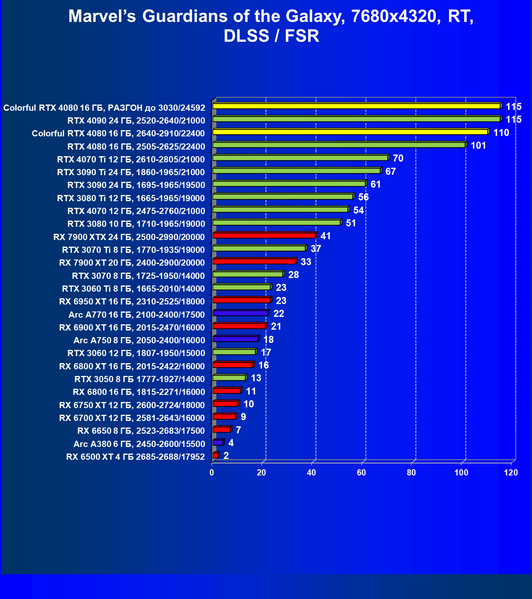- Результаты тестов с включенной аппаратной трассировкой лучей и DLSS/FSR/XeSS в разрешении 7680×4320 (8К)