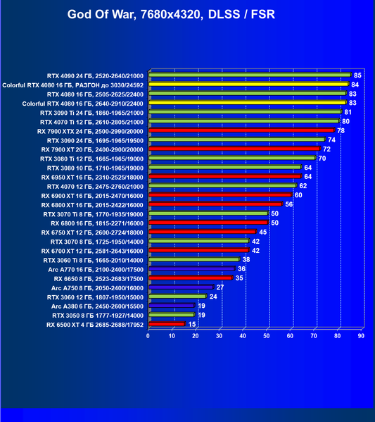 | 08 | RX 7900 XT 20 ГБ, 2400—2900/20000 | 784 | 91 | 86 000 |