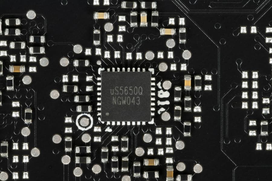 Также на тыльной стороне карты имеется контроллер uS5650Q (uPI Semi), который отвечает за мониторинг карты (отслеживание напряжений и температуры).