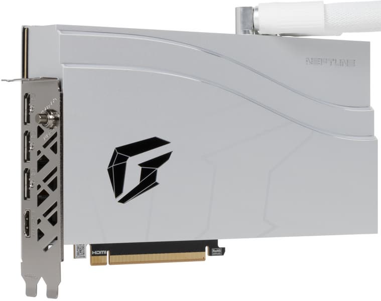 Colorful iGame GeForce RTX 4080 Neptune OC-V (16 ГБ) — очень интересный представитель флагманского ускорителя игрового класса последнего поколения. Габариты самой карты составляют всего 354×171×42 мм, она занимает 2 слота в корпусе, но при этом имеет выносной радиатор необслуживаемой системы жидкостного охлаждения, так что в корпусе должно быть место под стандартный трехвентиляторный радиатор (3×120 мм). Система охлаждения не слишком шумная, хотя вентиляторы вращаются постоянно.
