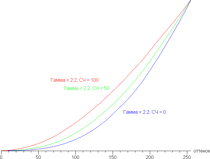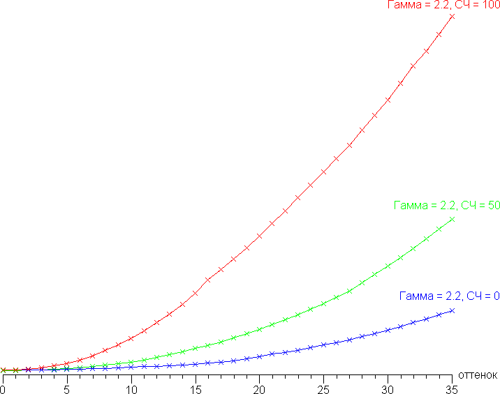 Дополнительной настройкой Стабилизация Черного (значения от 0 до 100, с шагом 10, по умолчанию 50) можно скорректировать гамма-кривую, улучшая (>50) или ухудшая (<50) различимость деталей в тенях. Первое может быть полезно в играх с темными сценами. Ниже приведены гамма-кривые при трех значениях Стабилизация Черного (СЧ):