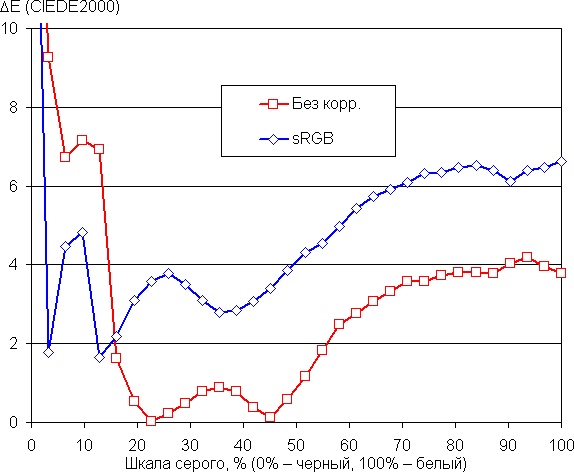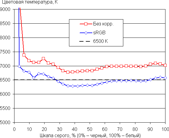 Цветовой баланс просто при выборе профиля без коррекции для настройки Цветовая температура, который обеспечивает максимальную яркость и контрастность с сохранением приемлемого качества изображения, хороший, так как цветовая температура достаточно близка к стандартным 6500 К, и отклонение от спектра абсолютно черного тела (параметр ΔE) ниже 10. При этом оба параметра мало изменяются на различных участках шкалы серого, что улучшает визуальное восприятие цветового баланса. После выбора профиля sRGB цветовая температура еще больше приближается к 6500 К, но ΔE немного возрастает, однако цветовой баланс все равно остается достаточно хорошим для любых работ, не требующих особо точной цветопередачи. Графики ниже показывают цветовую температуру на различных участках шкалы серого и ΔE для профилей без коррекции и sRGB.
