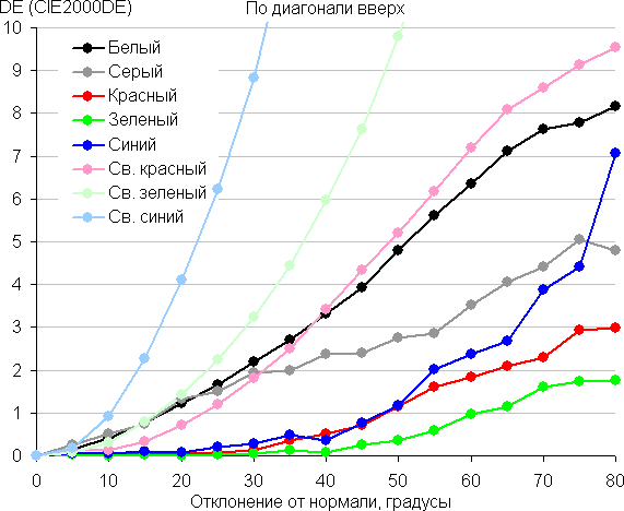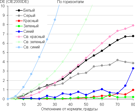 Для количественной характеристики изменения цветопередачи мы провели колориметрические измерения для белого, серого (127, 127, 127), красного, зеленого и синего, а также светло-красного, светло-зеленого и светло-синего полей во весь экран с использованием установки, подобной той, что применялась в предыдущем тесте. Измерения проводились в диапазоне углов от 0° (датчик направлен перпендикулярно к экрану) до 80° с шагом в 5°. Полученные значения интенсивностей были пересчитаны в ΔE относительно замера каждого поля при перпендикулярном положении датчика относительно экрана. Результаты представлены ниже: