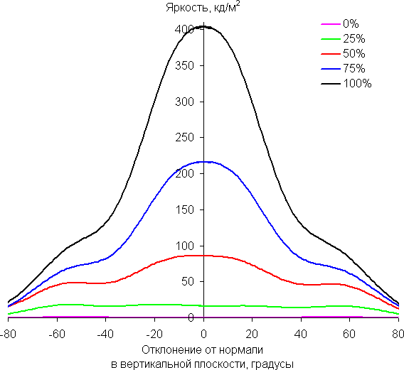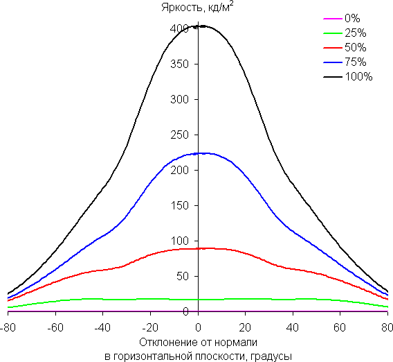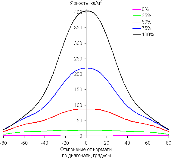 Из графиков следует, что при взгляде под углом хотя бы основные цвета меняются несильно, но полутона (особенно светло-синий) существенно изменяются, что ожидаемо для матрицы типа *VA и является ее основным недостатком.