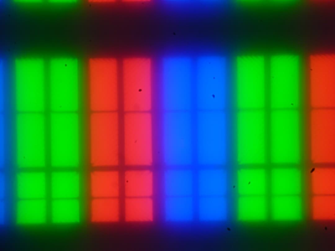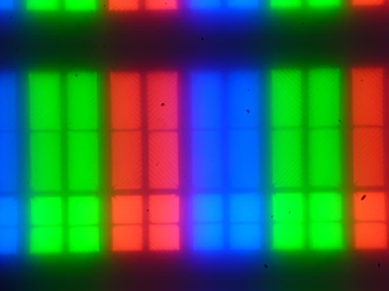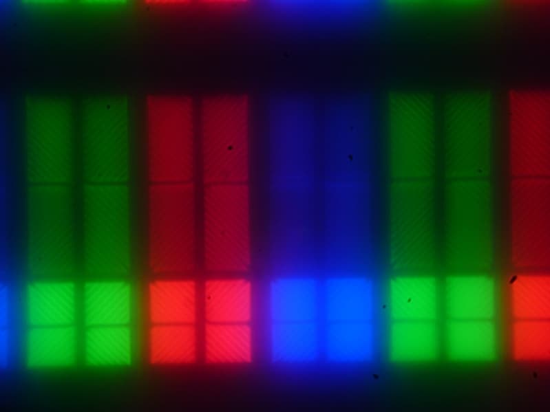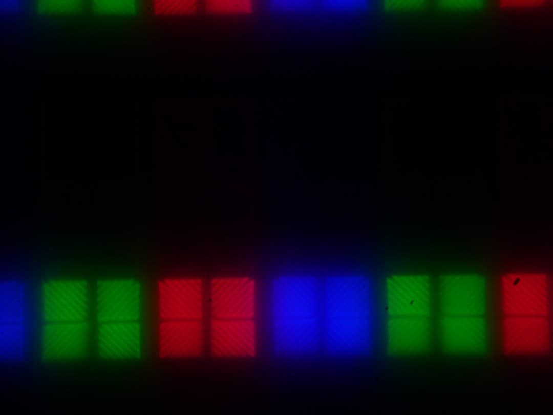 Четкое изображение структуры пикселей из-за матовой поверхности получить не удается, впрочем, при желании на фрагменте ниже можно разглядеть типичную для VA структуру в виде параллельных полосок. Субпиксели трех цветов (красного, зеленого и синего) поделены на две различающиеся по площади и независимо управляемые области, каждая из которых разделена на четыре участка с доменами в различающейся ориентации. Такое сложное устройство в принципе способно обеспечить широкий динамический диапазон по количеству оттенков, так как с ростом яркости области включаются последовательно, и хорошие углы обзора, чему способствует вариация ориентации ЖК в доменах (черные точки — это пыль на матрице фотоаппарата):