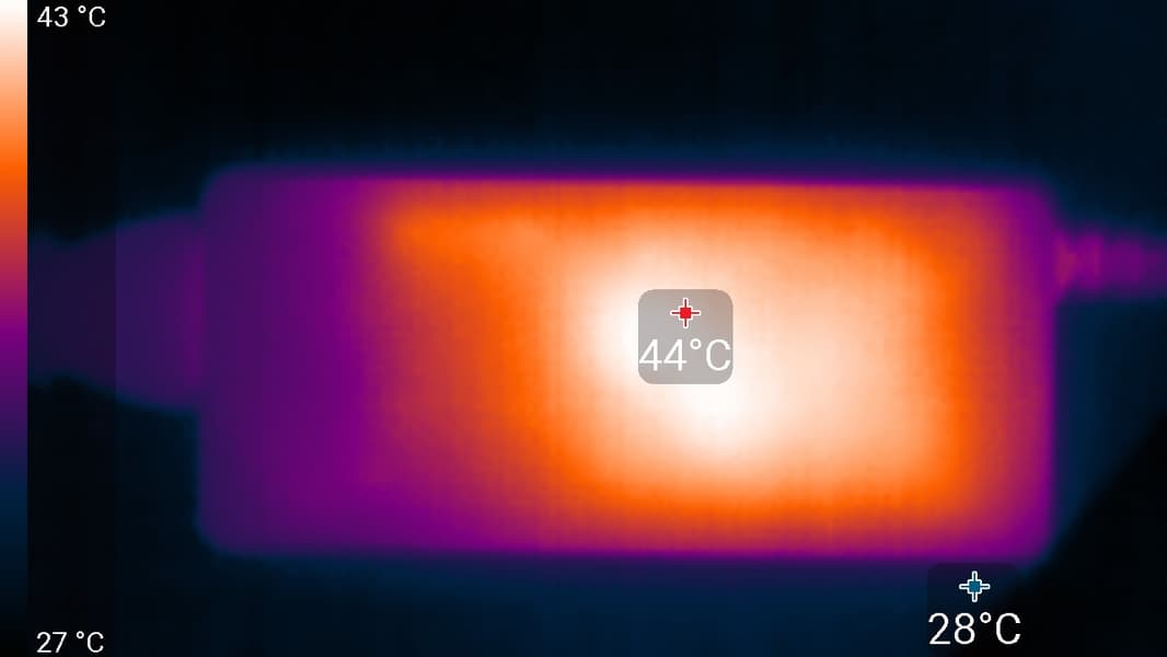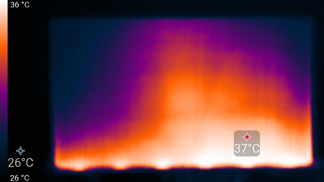 По распределению областей нагрева, можно предположить, что внизу находится светодиодная линейка подсветки экрана. Нагрев сзади умеренный.