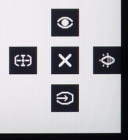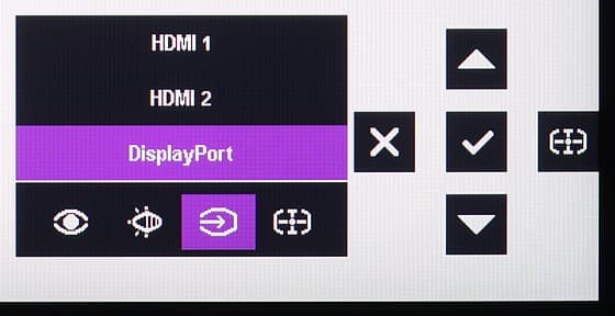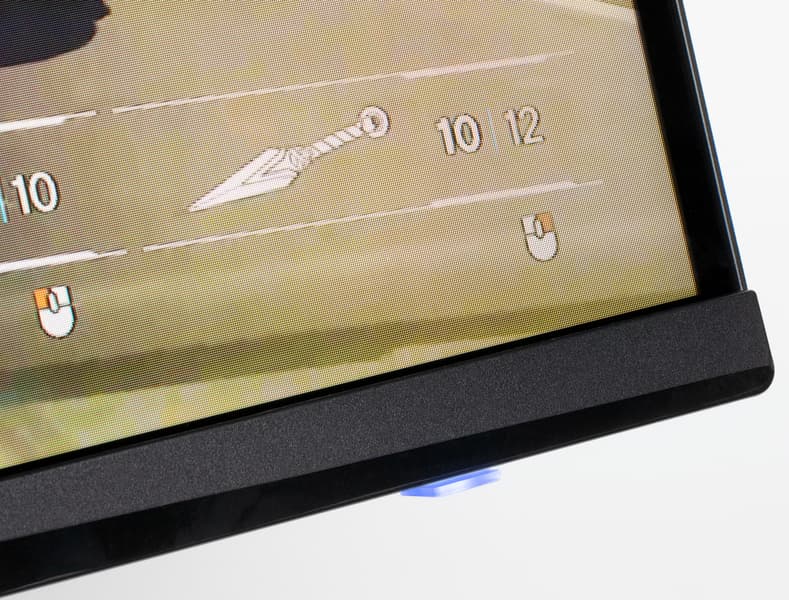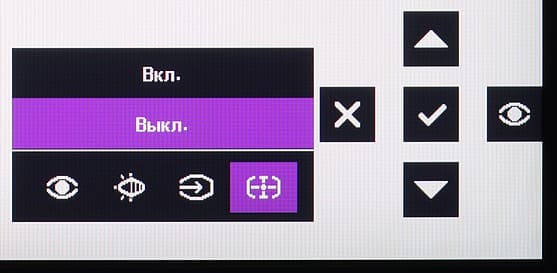 Индикатор питания неярко светится синим при работе (можно отключить в меню), оранжевым в режиме ожидания, и не горит, если монитор условно выключен. Когда на экране нет меню, то при долгом нажатии на джойстик монитор выключается (для включения достаточно короткого нажатия), а при отклонении джойстика на экране появляется стартовое меню настроек: