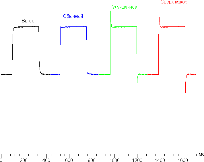 По мере увеличения разгона на графиках некоторых переходов появляются характерные всплески яркости. Ниже приведены графики полутонового перехода между оттенками 70% и 90% и обратно при различных значениях настройки OverDrive (по вертикали — яркость, по горизонтали — время, для наглядности графики выстроены последовательно):