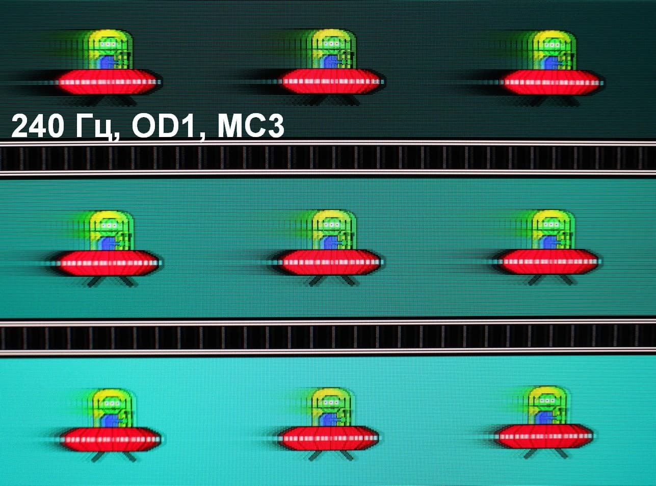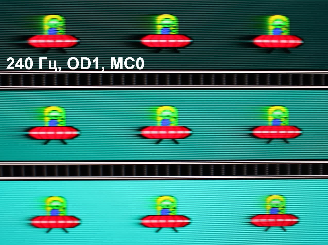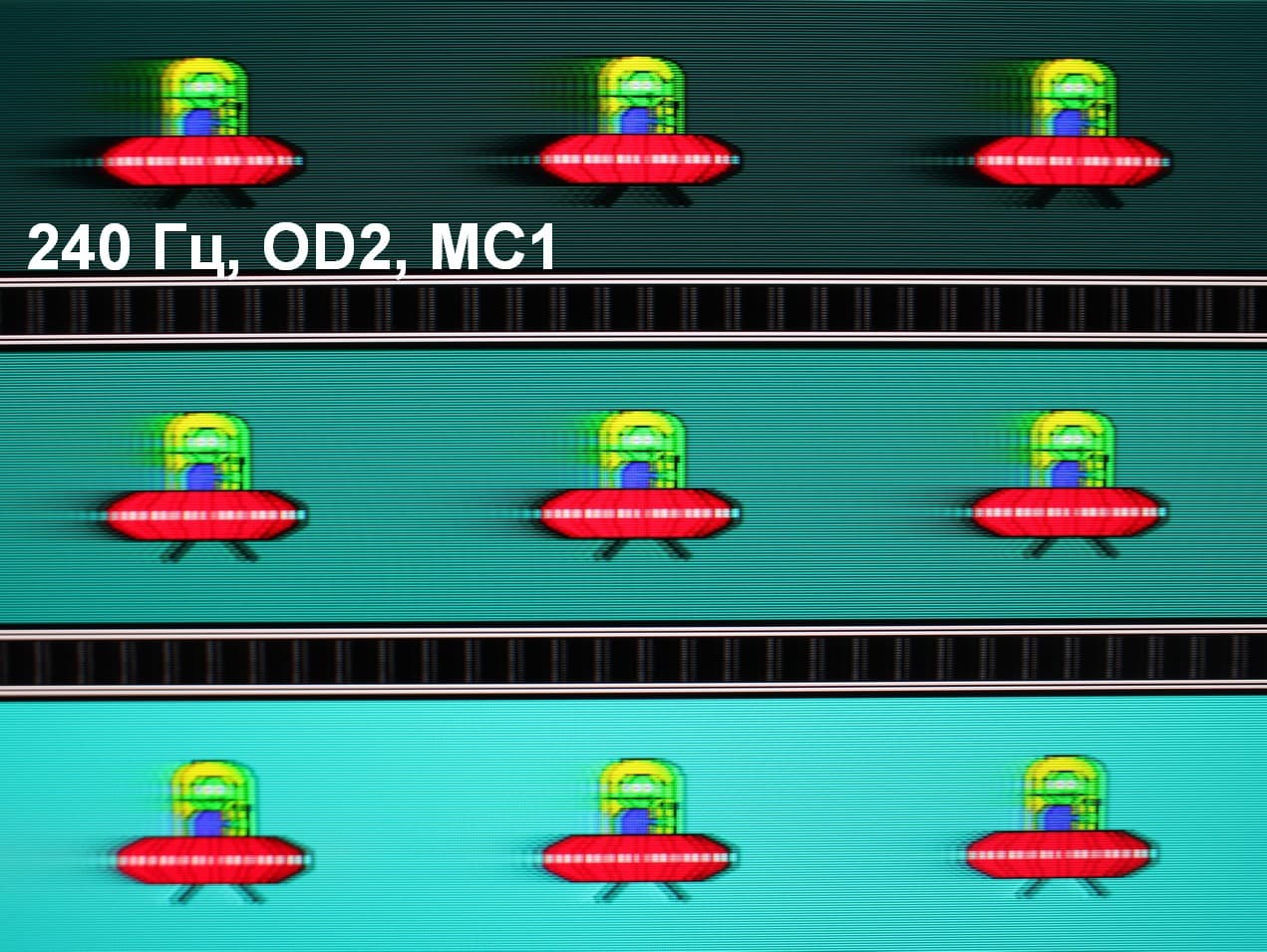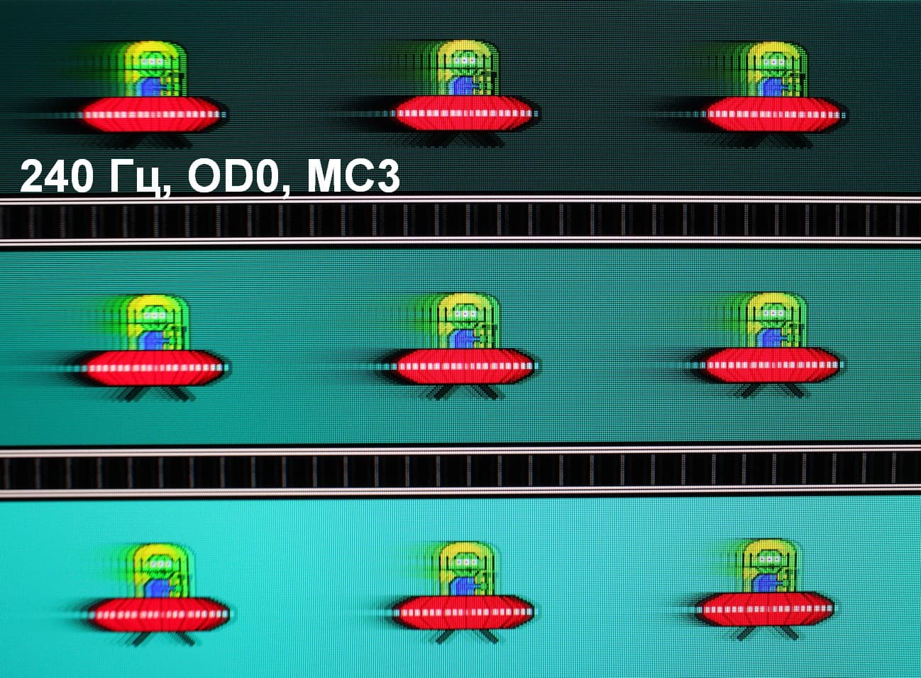 Для наглядного представления о том, что на практике означает такая скорость матрицы, какие могут быть артефакты от разгона и повышает ли четкость в движении, описанная выше настройка Motion Clearness, приведем серию снимков, полученных с помощью движущейся камеры. Такие снимки показывают, что видит человек, если он следит глазами за двигающимся на экране объектом. Описание теста приведено тут, страница с самим тестом тут. Использовались рекомендованные установки (скорость движения 960 пиксель/с для частот обновления 60, 120 и 240 Гц), выдержка 1/15 с, на фотографиях указаны значения частоты обновления, а также ступень разгона (ODx) и ступень режима Motion Clearness (MCx).